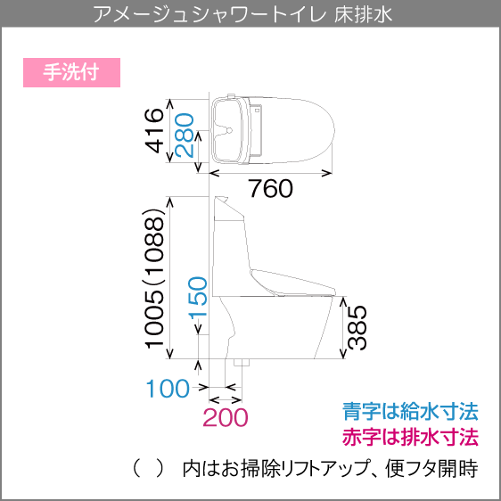 ・ 床排水: 排水芯は便器後方、壁面より200mmタイプですのでご注意下さい。