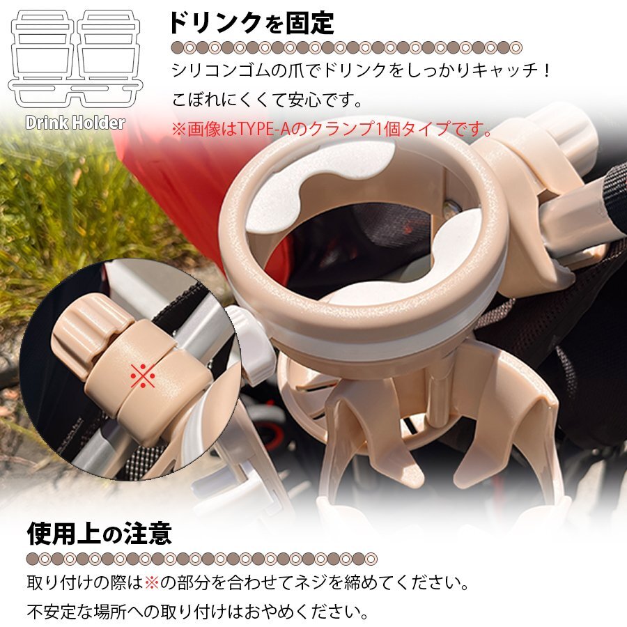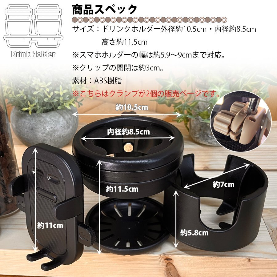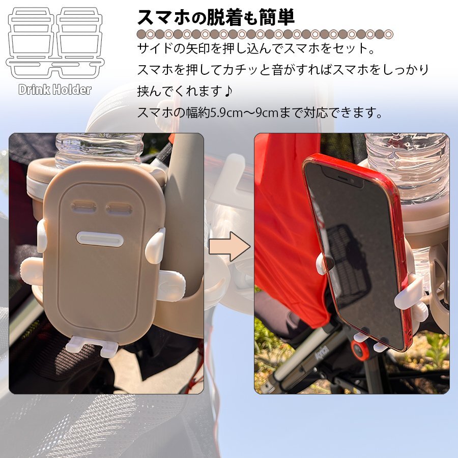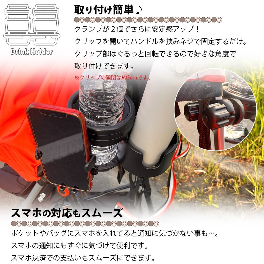 | ・ベビーカーに取り付け可能なドリンクホルダー!クランプが2個でさらに安定感アップ! ・必要に応じて1本立て、2本立てにすることができます。 ・スマホホルダーもついてるので、片手で簡単操作ができる。 ・ドリンクホルダーにはシリコンゴムの爪がついてるので、ドリンクをしっかりホールド! ・取り付けも簡単!ハンドルを挟んでネジで固定。 ・車のヘッドレストへの取り付けもできるので、車内でも使えて便利♪ ・スマホホルダーに薄型のハンディファンを挟む事もできます。 ・選べるカラーは2色展開。 |