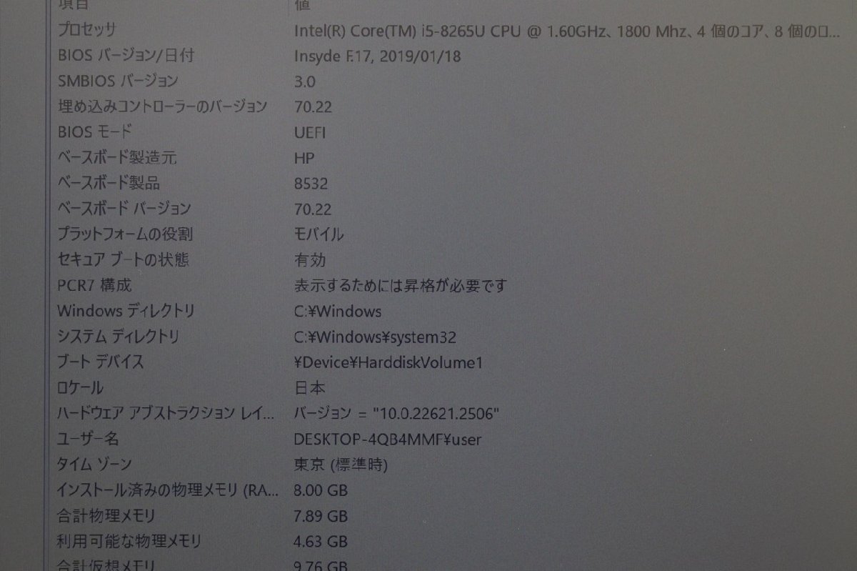 N 3【 i5第8世代 】HP /250 G7 / CPU:core i5-8265U@1.60GHz / メモリ:8G / SSD:256G / Windows11 Pro