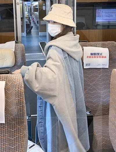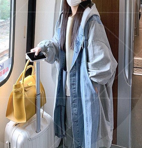 デニム&スウエット素材のロング丈デニムジャケット★新品★大きいサイズ★フードつきあったか薄手裏起毛