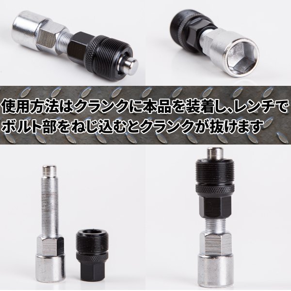 使用方法はクランクに本品を装着し、レンチでボルト部をねじ込むとクランクが抜けます