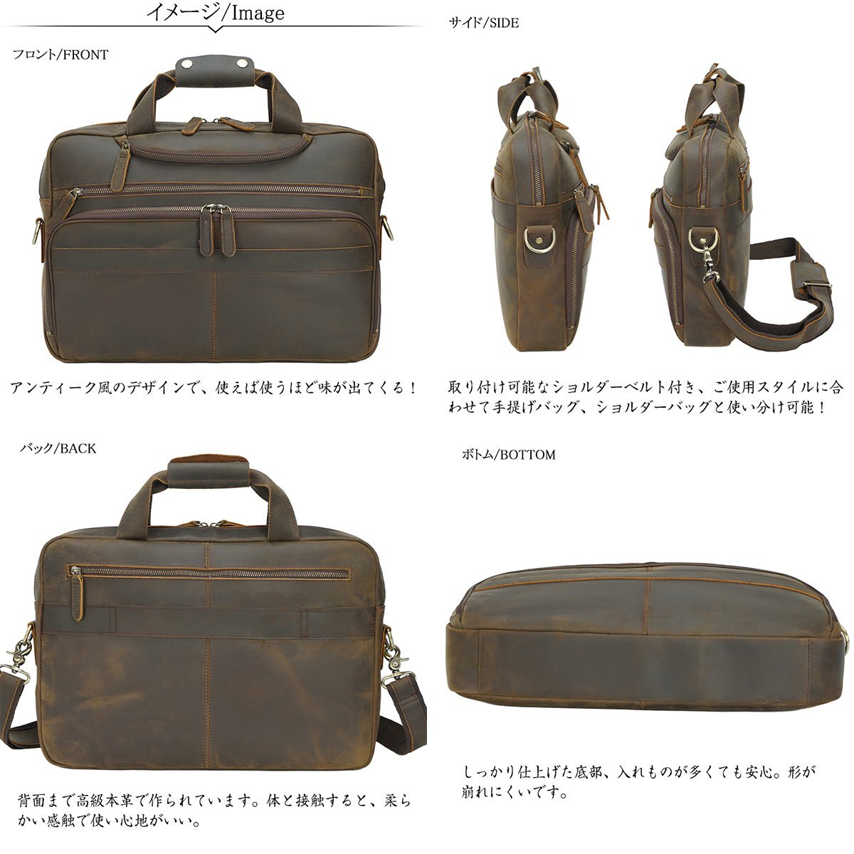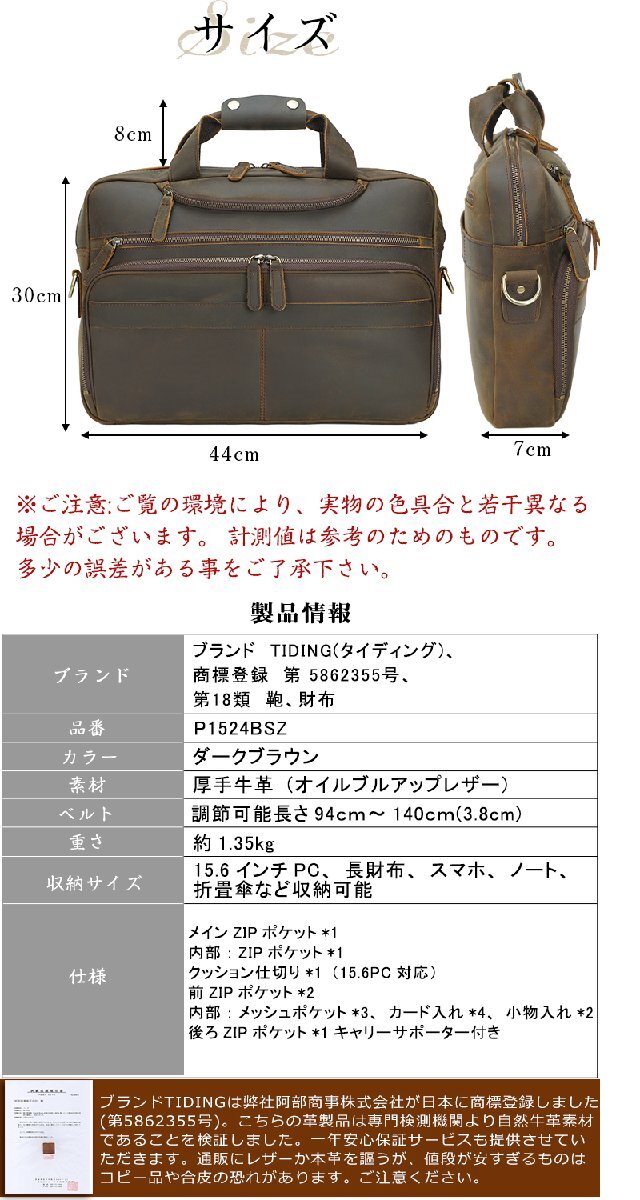 TIDING レトロ系 厚手牛革 メンズ ビジネスバッグ 本革 ブリーフケース 2WAY B4 書類鞄 前ガジェットポーチ付き 整理上手