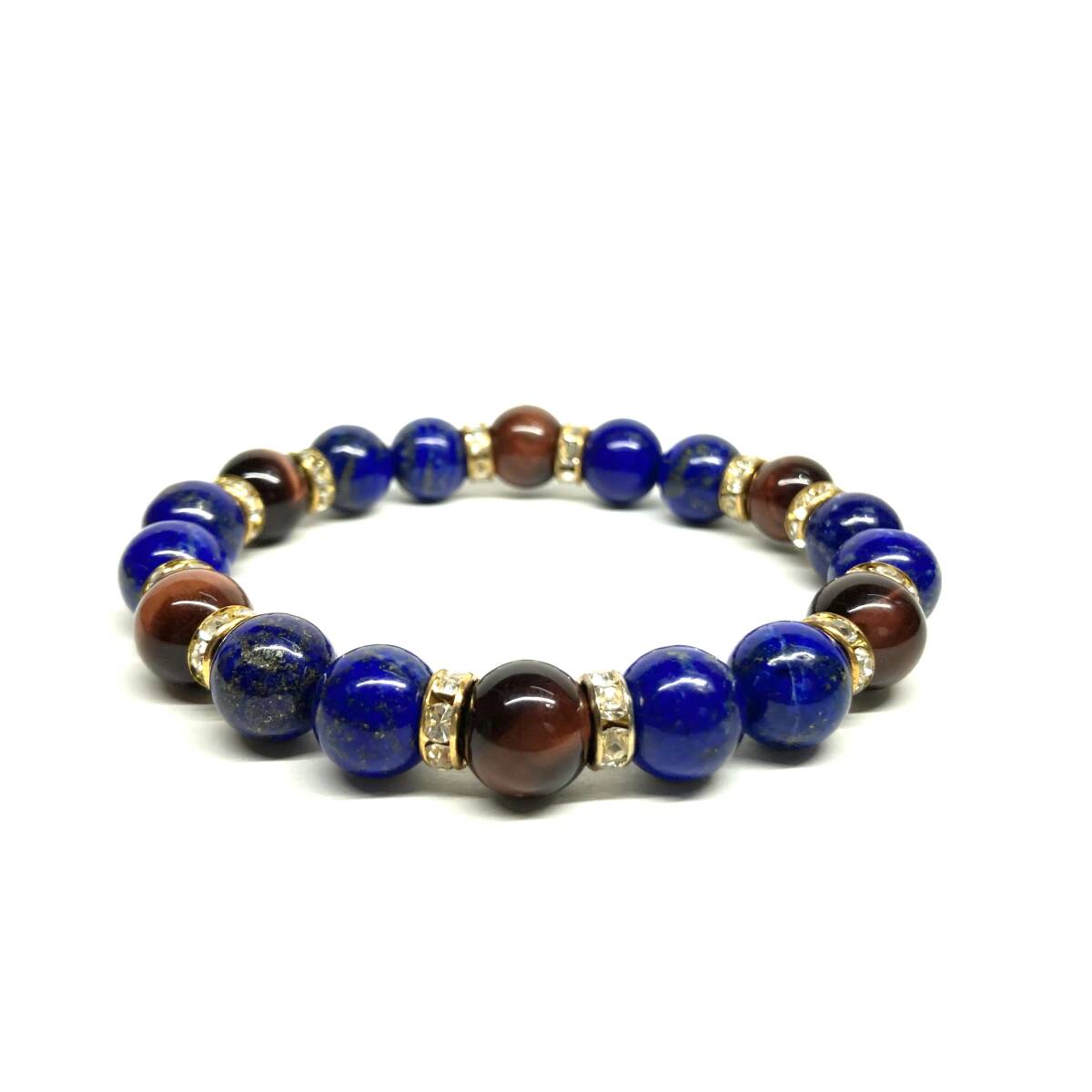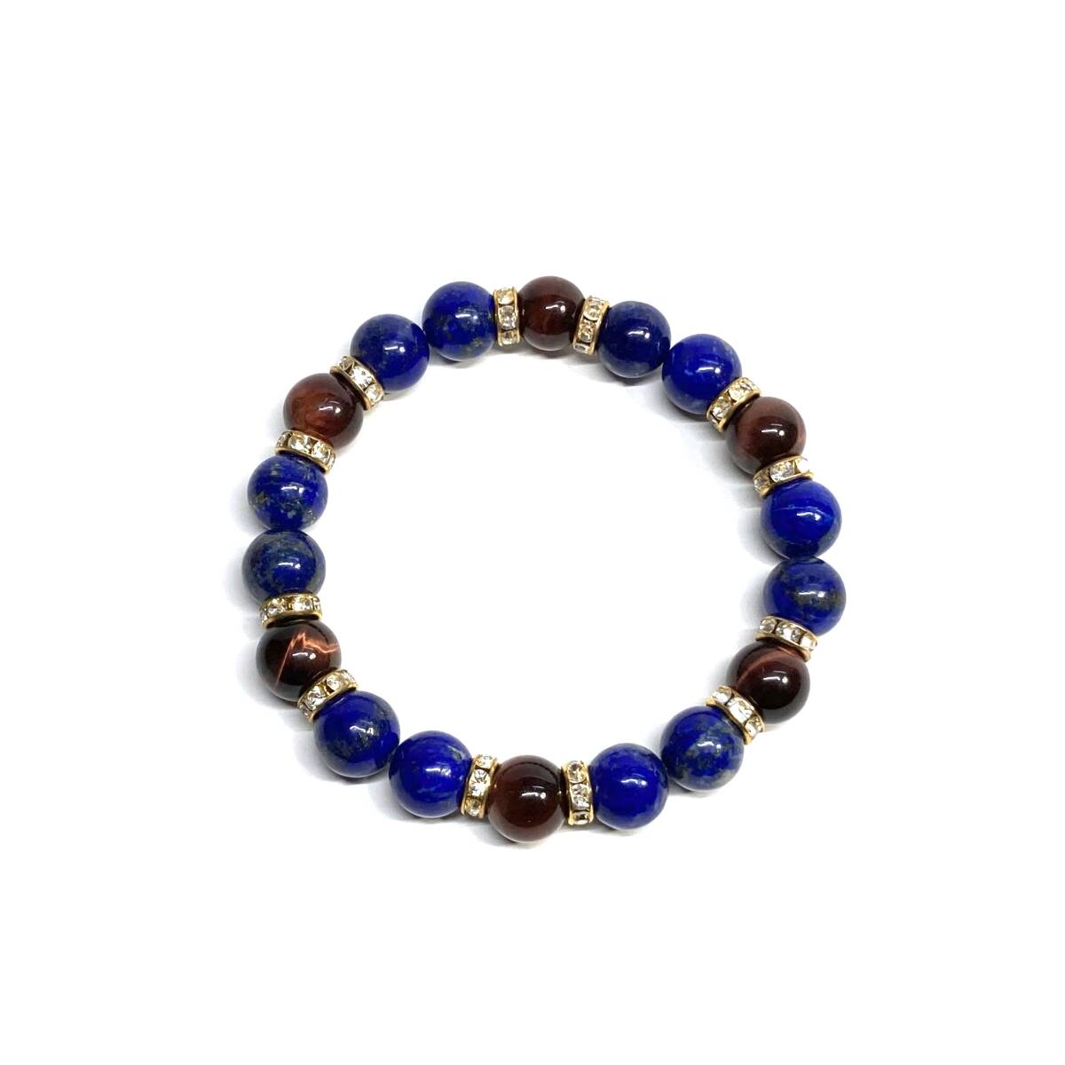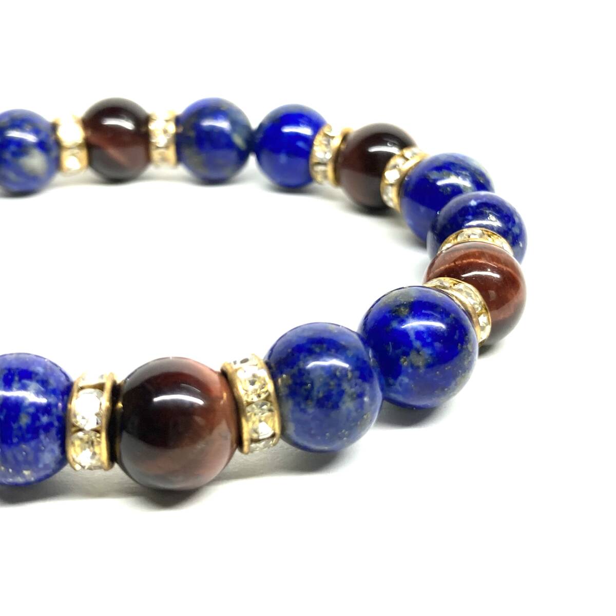 こちらは、ラピスラズリとレッドタイガーアイを組み合わせたパワーストーンブレスレットです。間にはロンデルを挟み高級感あるデザインに仕上げております。石大きさは腕にも馴染みやすいように10mm玉で内径約18cm(伸可能)です。(サイズ変更の場合は取引ナビにてご連絡をお願いします。) 数に限りがございますので気になる方はお早めにどうぞ。