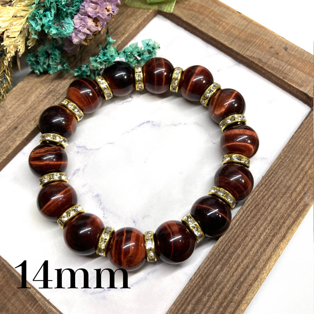 こちらは、14mm玉のレッドタイガーアイを使用した天然石ブレスレットです。石との間にはロンデルを挟み高級感を演出しています。シンプルなデザインですのでどんなコーディネートとも合わせ易いブレスレットです。石大きさは14mm玉です。内周約17cmです。パワーストーンを付けてる方へのプレゼントにもお勧めです。14mmサイズのリクエストが多々ありましたので少量ですが販売しました。気になる方はお早めにどうぞ。