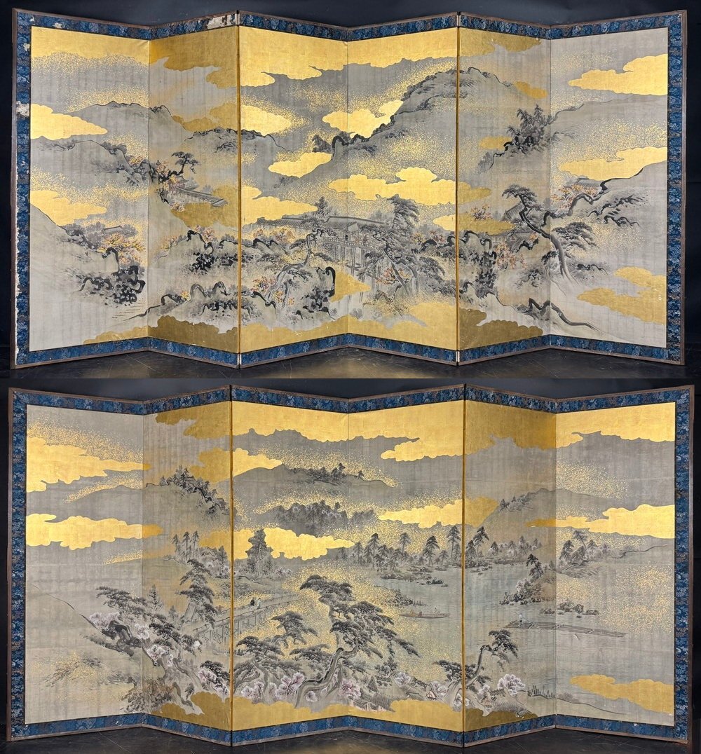 【都屋】金砂子 嵐山渡月橋東福寺通天橋図 屏風 六曲一双 無落款 紙本肉筆 g1 1216