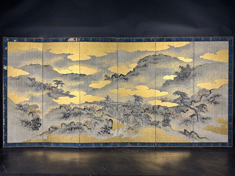 【都屋】金砂子 嵐山渡月橋東福寺通天橋図 屏風 六曲一双 無落款 紙本肉筆
