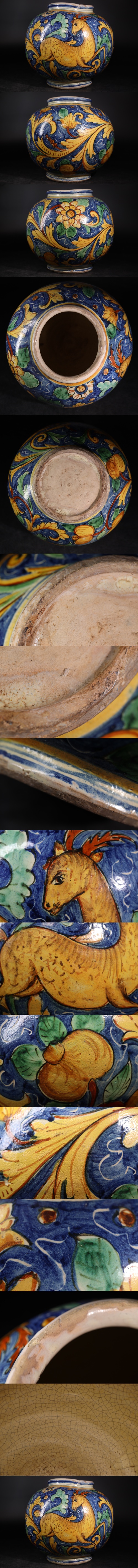 | 時代 マジョリカ マヨリカ 色絵 麒麟図 壺 イタリア陶磁 / アンティーク 飾壺 花器 花瓶 煎茶飾 .G3262 |