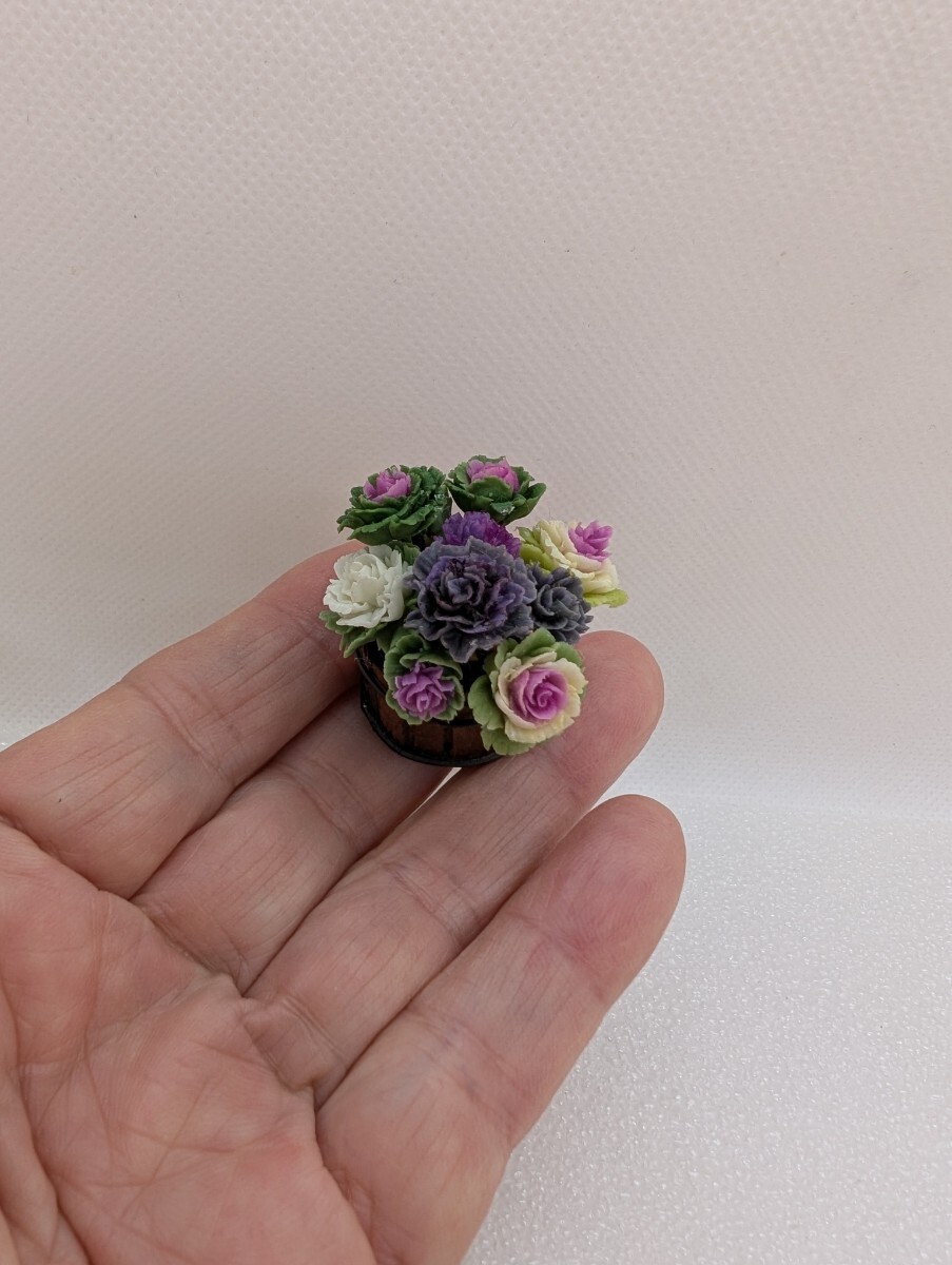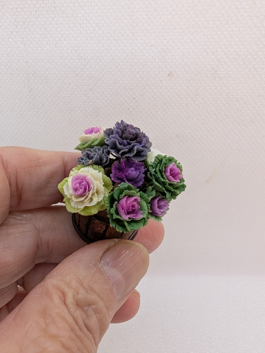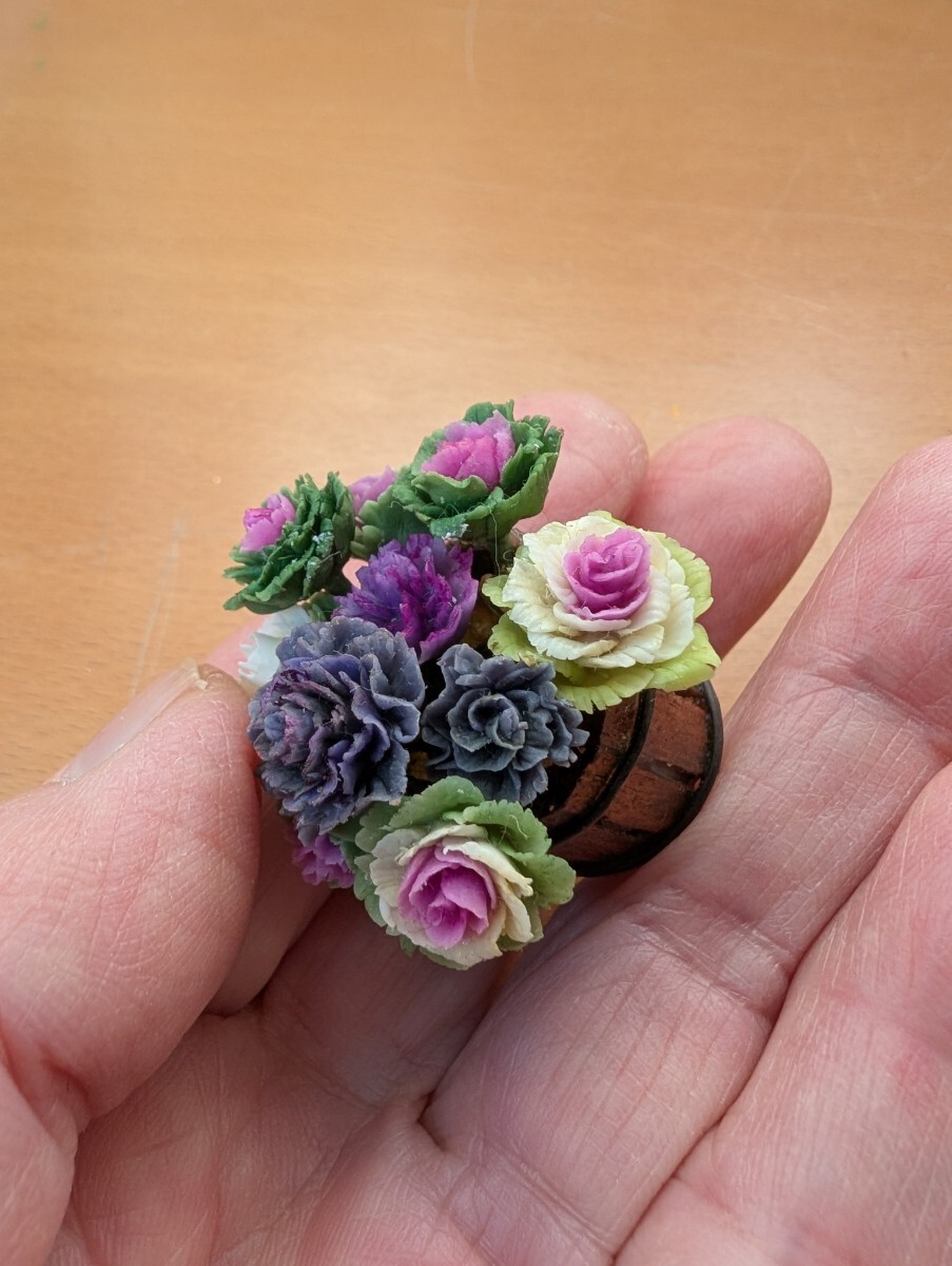 樹脂粘土でいろんな葉牡丹を作り、手作りのプランターに植えました。