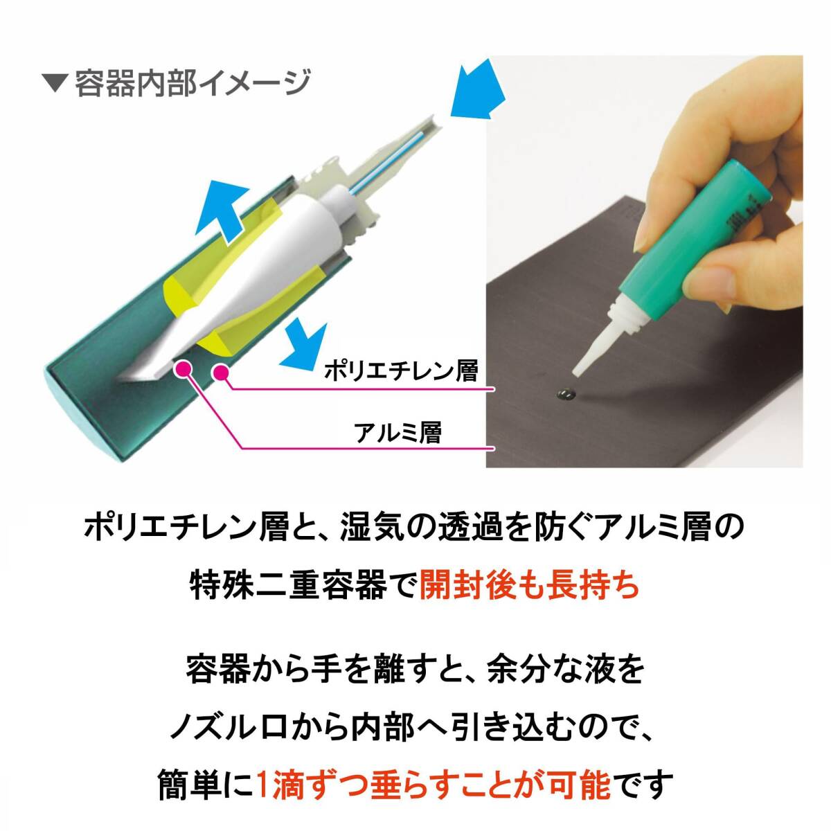 衝撃に強いので、硬い金属同士の接着に最適 【用途】 合成ゴム・硬質プラスチック・金属の接着 【特徴】 ・簡単・安心・便利を実現した特製容器使用の液状の瞬間接着剤 ・キャップを閉めこんで開封するので、ピンや針は不要 ・プッシュボタンを押すことで適量が塗布でき、開けても長持ちする ・容器が立つので、作業中に液だれがない