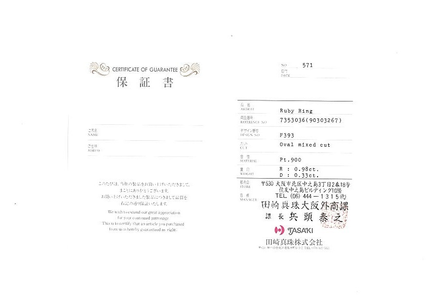 | 【商品ランク】 ※詳細はランク表をご確認下さい。 S 【ジャンル】 リング/指輪/ring 【ブランド】 タサキ/田崎真珠/TASAKI 【素材】 Pt900/プラチナ 【重量】 6.4g 【サイズ】 リングサイズ:16.5号 デザイン幅:約7.8mm リング腹側幅:約3.0mm ※ルビーのパビリオン側には天然内包フラクチャーの表面派生がございます。 【石目】 ルビー:0.98ct サイズ:約6.0×4.8mm ダイヤモンド:総計0.33ct 【付属品】 保証書/鑑別書 ※経年による匂いがございます。 【商品状態】 新品仕上げ済み ※リング腹側にはごく僅かなサイズ直し跡がございますが、着用時に目に付く箇所ではございません。 【商品管理番号】 182249 |