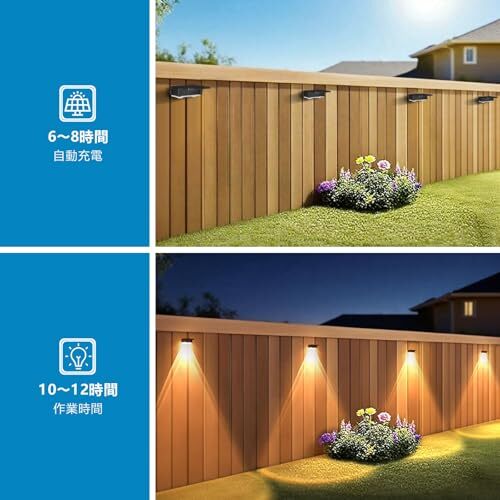 【長時間点灯&自動点灯/消灯】ソーラーフェンスライトは直射日光下で6~8時間フル充電すると、夜間10~12時間点灯します。日中はソーラーパネルが太陽光を電気に変換し、夕暮れから夜明けまで自動的に点灯します。スイッチを入れるだけで、夜間の照明をお楽しみいただけます。