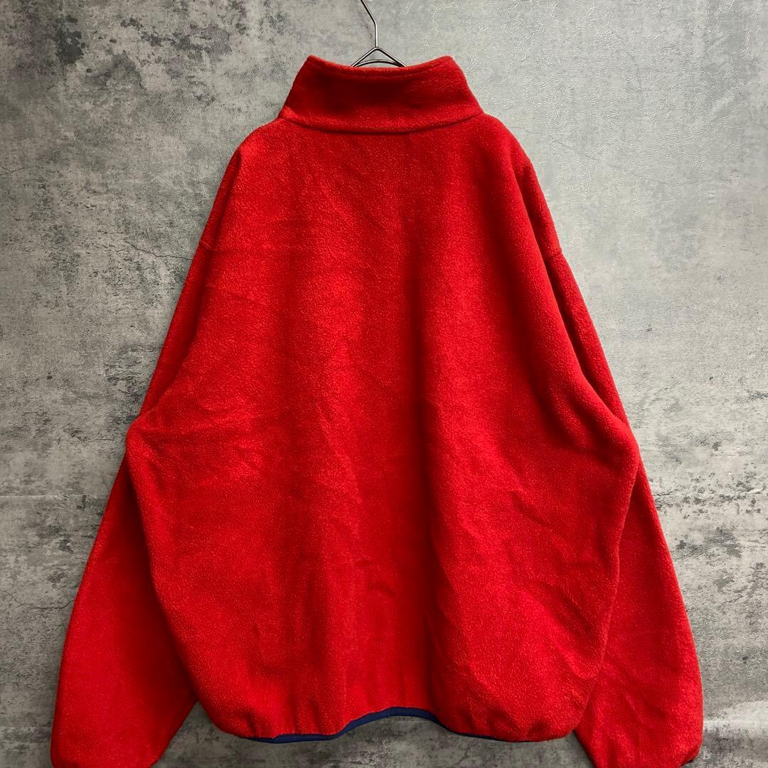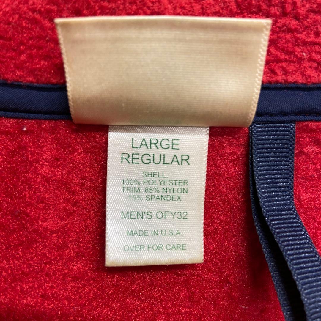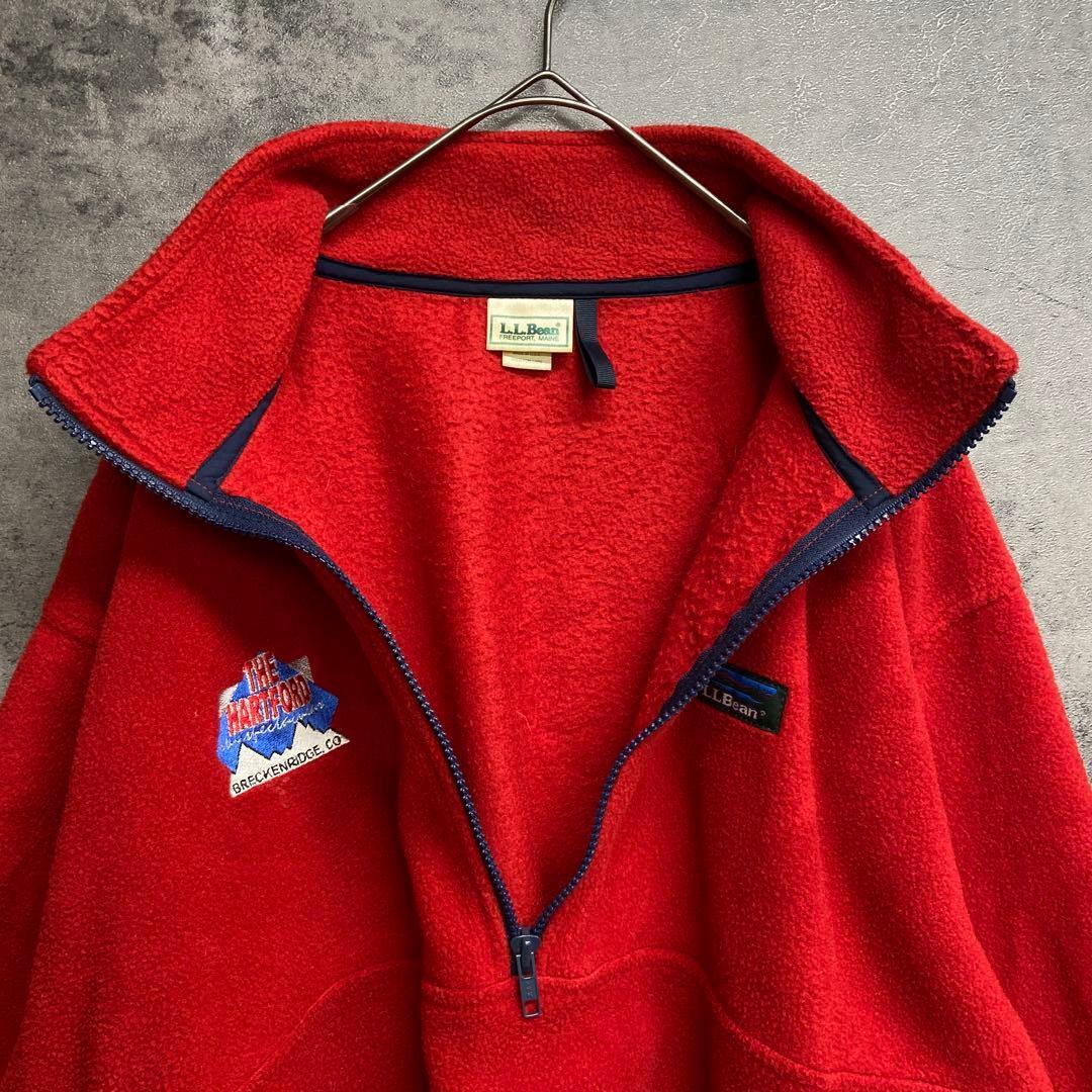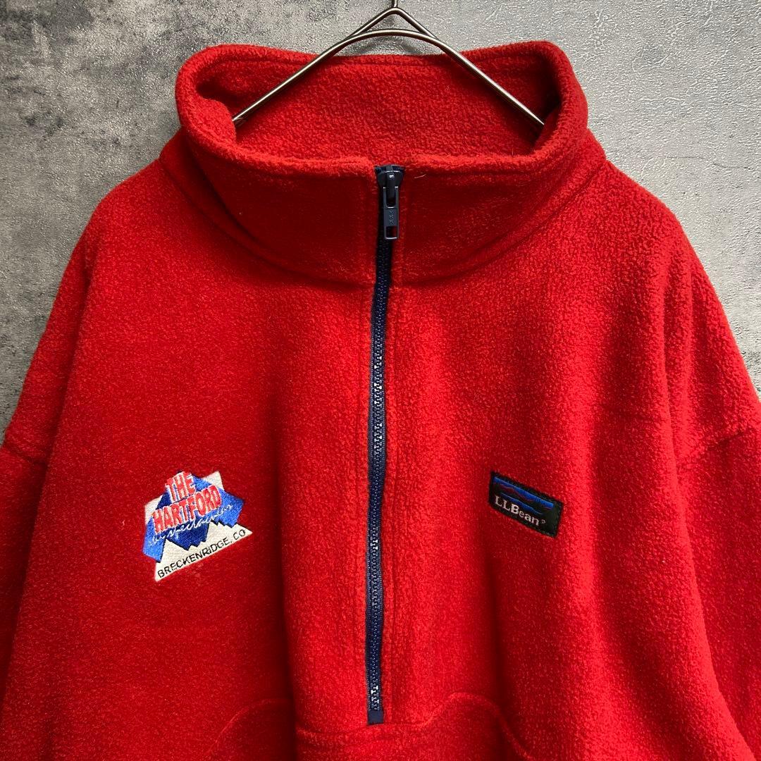 鮮やかなレッドに胸元のワッペン刺繍が映えるエルエルビーンのフリーストップス。軽く暖かい素材で着心地がよく、人気のUSA古着アイテムです。カジュアルにもアウトドアにも使える万能な一枚。