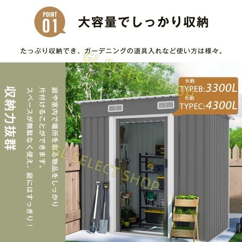 • 【屋根の溝は排水に役立つ】内部は濡れないために、斜面を設計しました。雨が降ると、屋根にたまることなく、斜面と凹槽を経由して地面に流れ落ちます。湿気から工具を守る頑丈で耐久性があり、変形しにくい、悪天候から内部の物品を保護します。