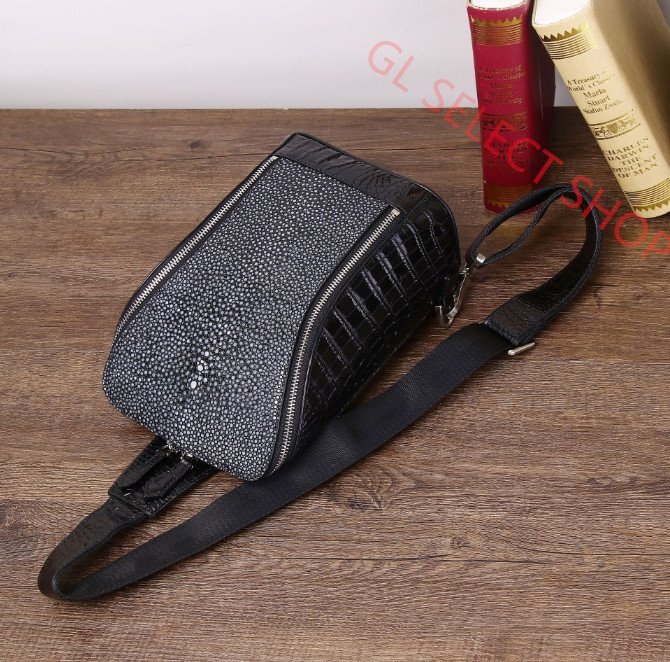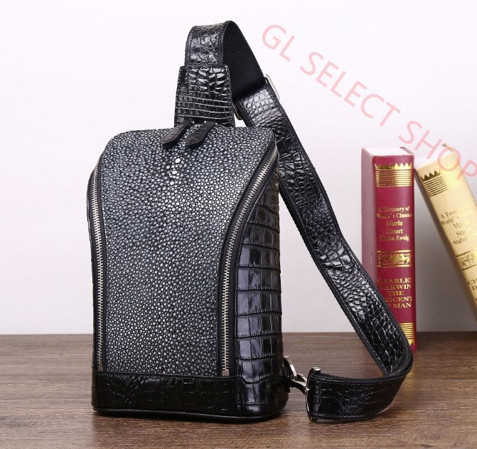 光沢感あり! エイ革 ショルダーバッグ ガルーシャ スティングレイ ブラック 黒 メンズ 斜め掛け レザー 本革 ポリッシュ加工 カバン 鞄