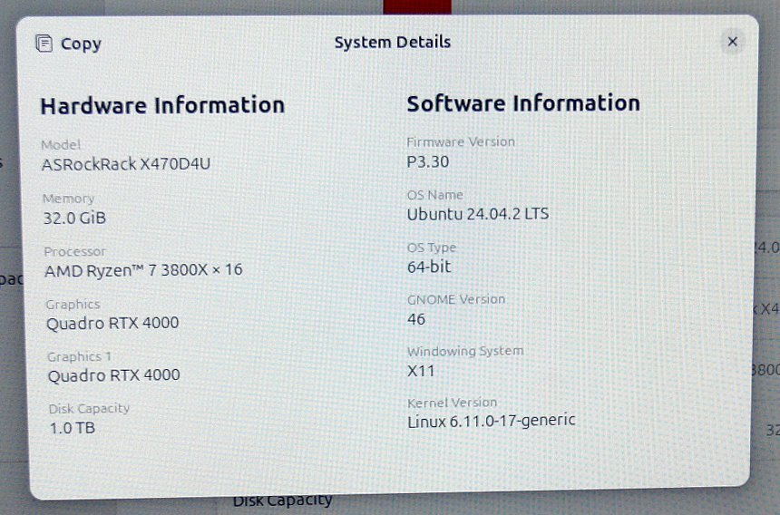 THERMALTAKE Versa H17 ■マザーボード ASRock X470D4U ■電源 Thermaltake TOUGHPOWER GRAND RGB850W ■グラフィックボード NVIDIA RTX4000 X2 ■CPU AMD Ryzen 7 3800X ■メモリー 32GB ( 16GB x 2 空きスロット 1 ) ■ストレージ SSD 1TB M.2 2280 NVMe ■インストール済みOS Ubuntu 24.04.02 LTS ■設置サイズ W205xD435xH385(mm) |
