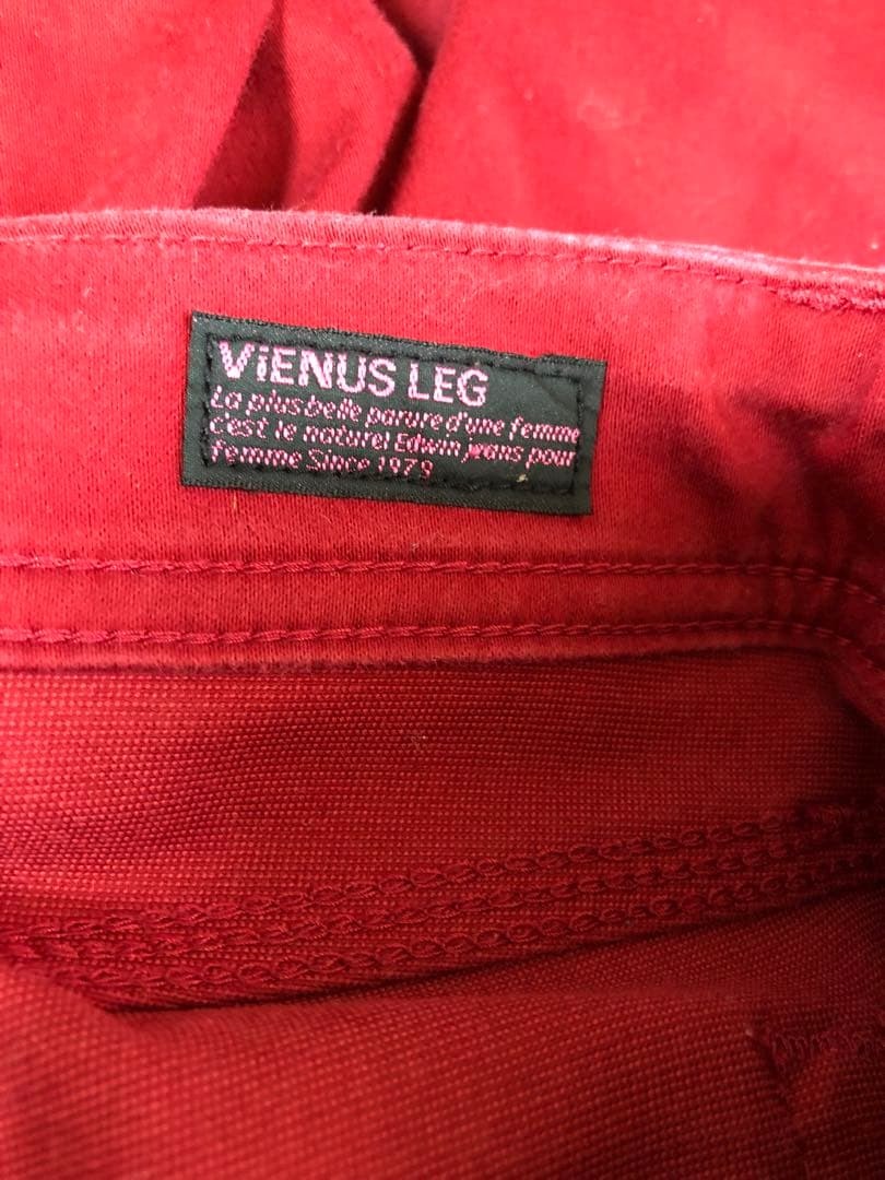 赤色のスキニーパンツ、ウエスト70cm、股下82cmのスタイリッシュなデザイン。