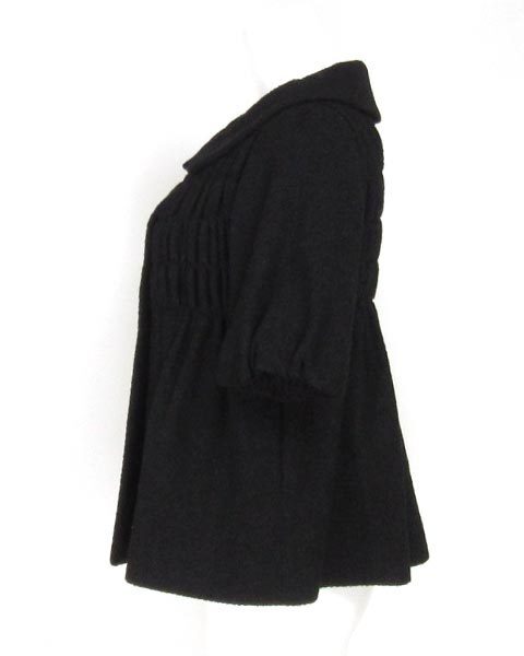 | ちょっとしたアウター代わりのアイテム♪ たくさんのシャーリングがおしゃれで可愛らしく 丸い襟が可愛さをさらにプラスしています。 肌寒い季節のアウター代わりにピッタリです。 シックなお色なので、甘くなりすぎず 大人かわいい雰囲気になりますよ。 毛羽立ち、毛玉などの使用感がございます。 実寸 肩幅39cm バスト92cm 着丈52.5cm 袖丈28cm 【サイズ】:(40) 【素 材】:(ウール86%、ナイロン14%) 【 色 】:(黒) 【程 度】:(AB) 管理番号 8542-20110823-018 256 003 | ||||