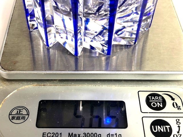 ◎HOYA 保谷 佐々文夫デザイン 重量感あり 深いカット ユニークなデザイン 青色被クリスタル ウィスキーグラス ロックグラス◎箱付z66