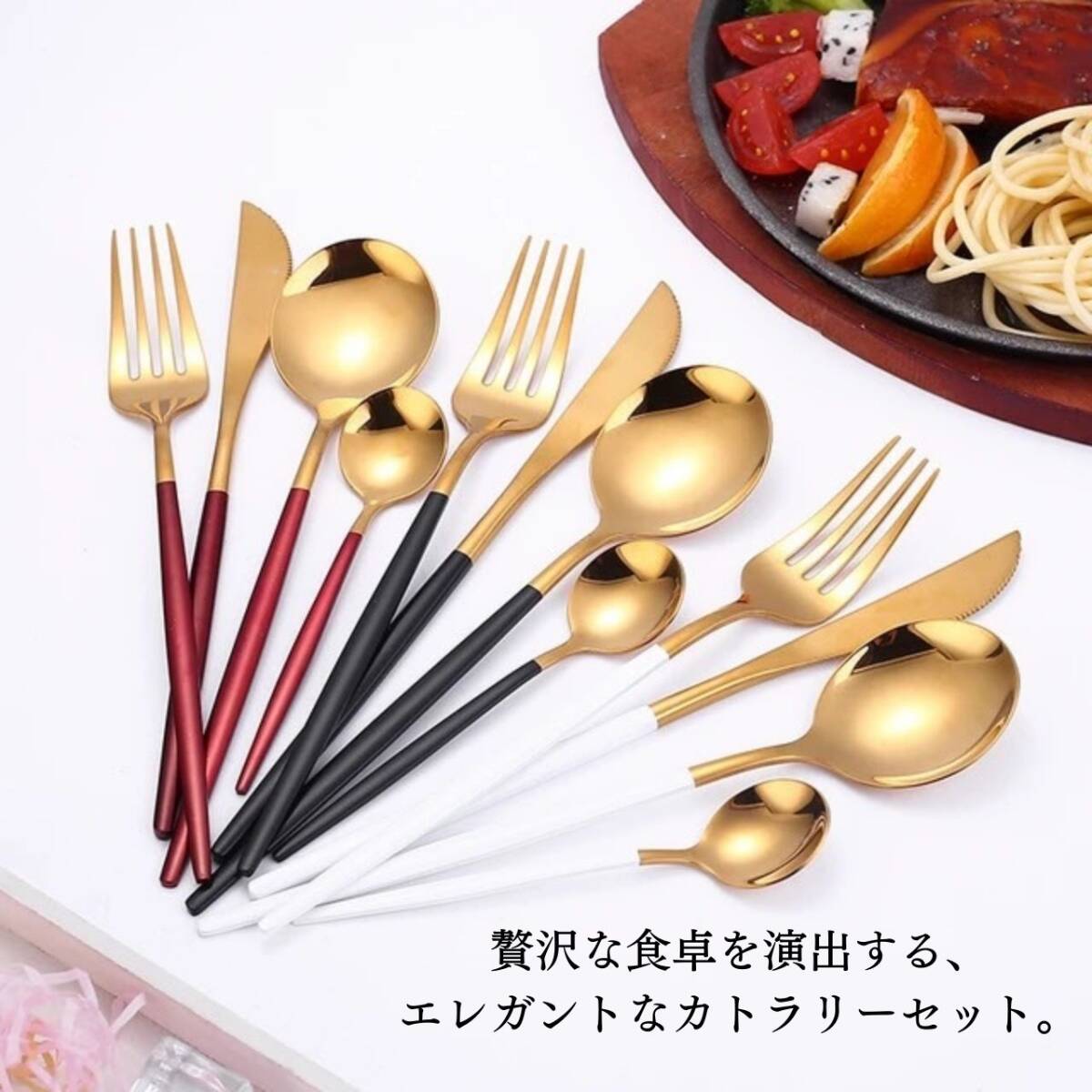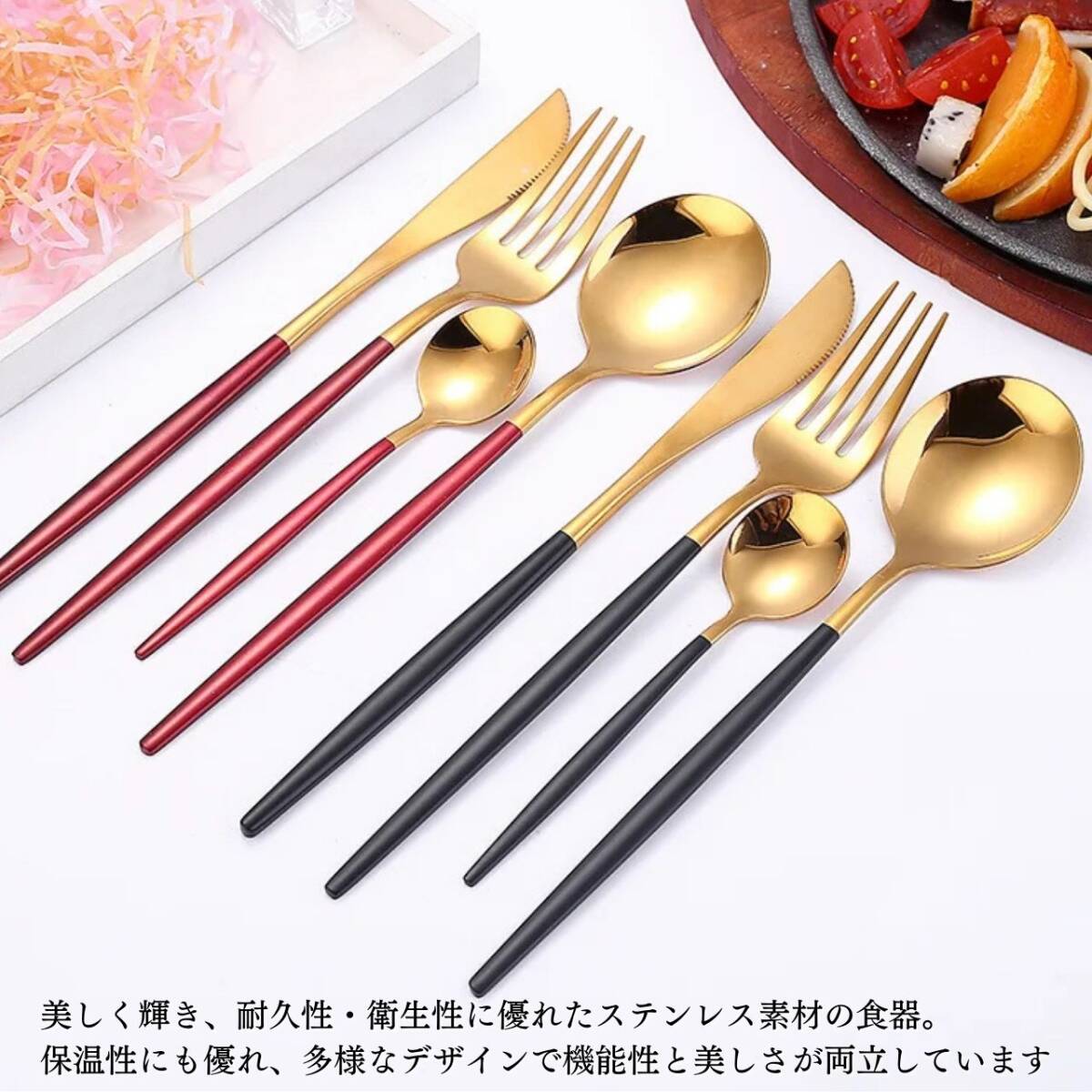 【お得!カトラリー8本セット】スプーン、ナイフ、フォーク、ティースプーンの4本セット×2【カラー】タイトル、商品画像1枚目をご確認ください。【食卓に彩りを】お好きなデザインを6種類から選べるカトラリー4本セット×2個自宅用にはもちろん、引越しや結婚祝いのギフトとしても人気のカトラリーセット。【日常使いに適したステンレス製】ステンレスは錆びにくさが特徴の素材です。光沢が美しく耐久性もあるので、日常使いに適しています。【商品詳細】材質:ステンレス製【セット内容】スプーン(幅4.5cm×長さ21cm 重さ37g)フォーク(幅2.7cm×長さ21cm 重さ30g)ナイフ(幅1.5cm×長さ22cm 重さ45g)ティースプーン(幅4cm×長さ18.5cm 重さ29g)【注意事項】・海外製品のため多少の傷や汚れ等ある場合がございます。・送料の都合上箱なし、簡易包装での発送となります。コメントなしでの即購入OKです。おまとめ買いでお値引きさせていただきます。お気軽にコメントください。gold silver gold×black gold×white gold×blue gold×redゴールド シルバー ブラック ホワイト ブルー レッド おしゃれ 可愛い食卓 キッチン 韓国 北欧 セット販売 お得 金 ゴン 黒 白 青 赤新居 引っ越し 食器 プレゼント 結婚祝い ギフト カップル カフェ"