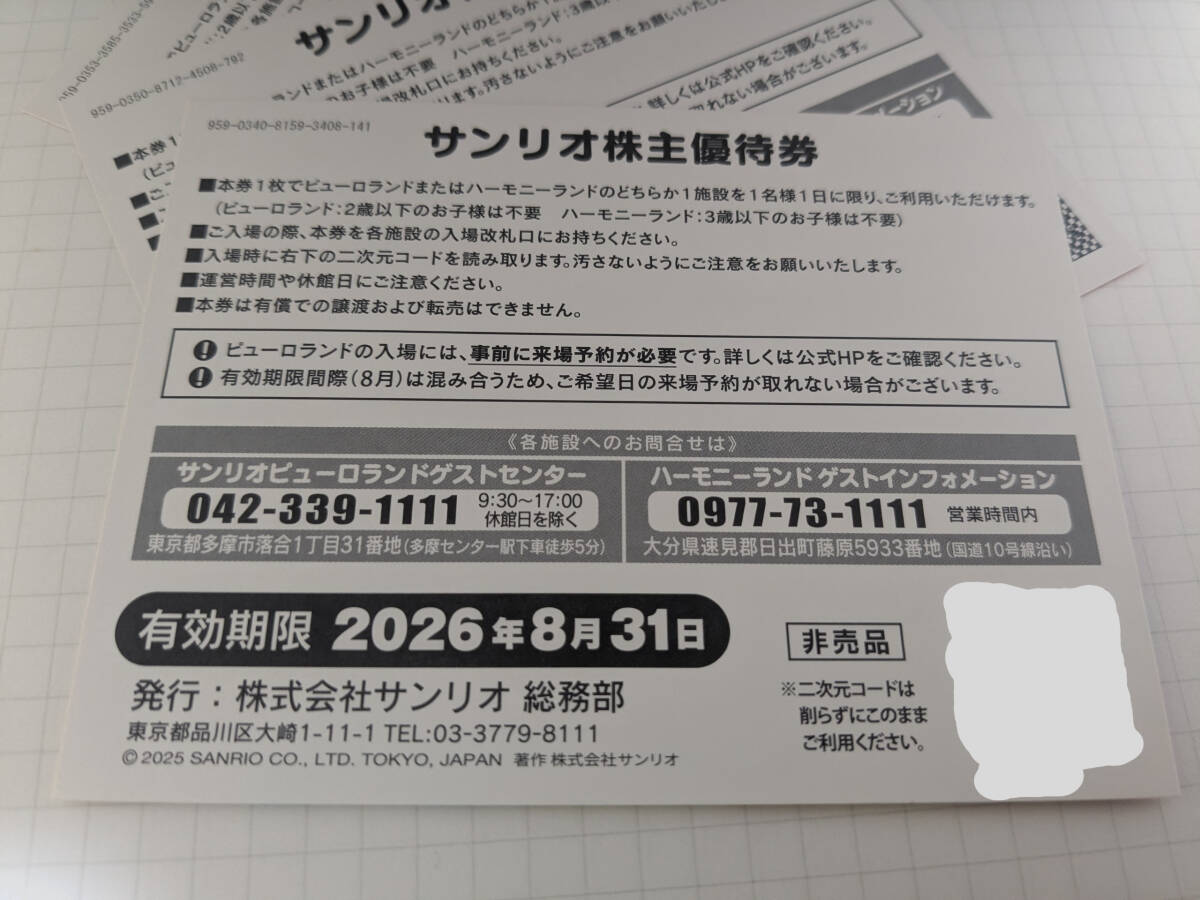 サンリオピューロランド、ハーモニーランドで使える優待券3枚。