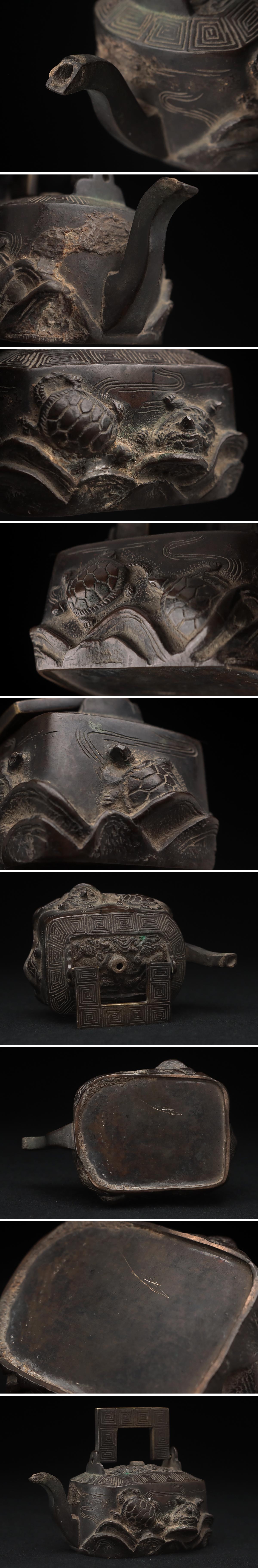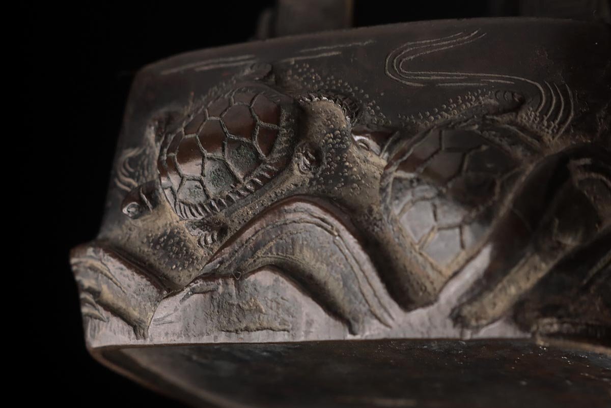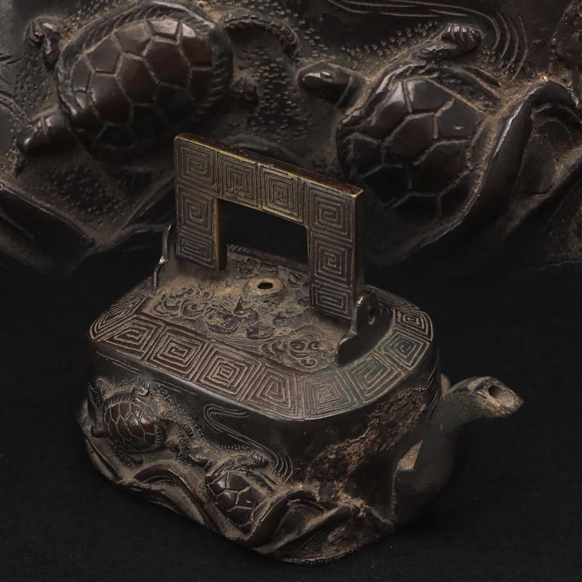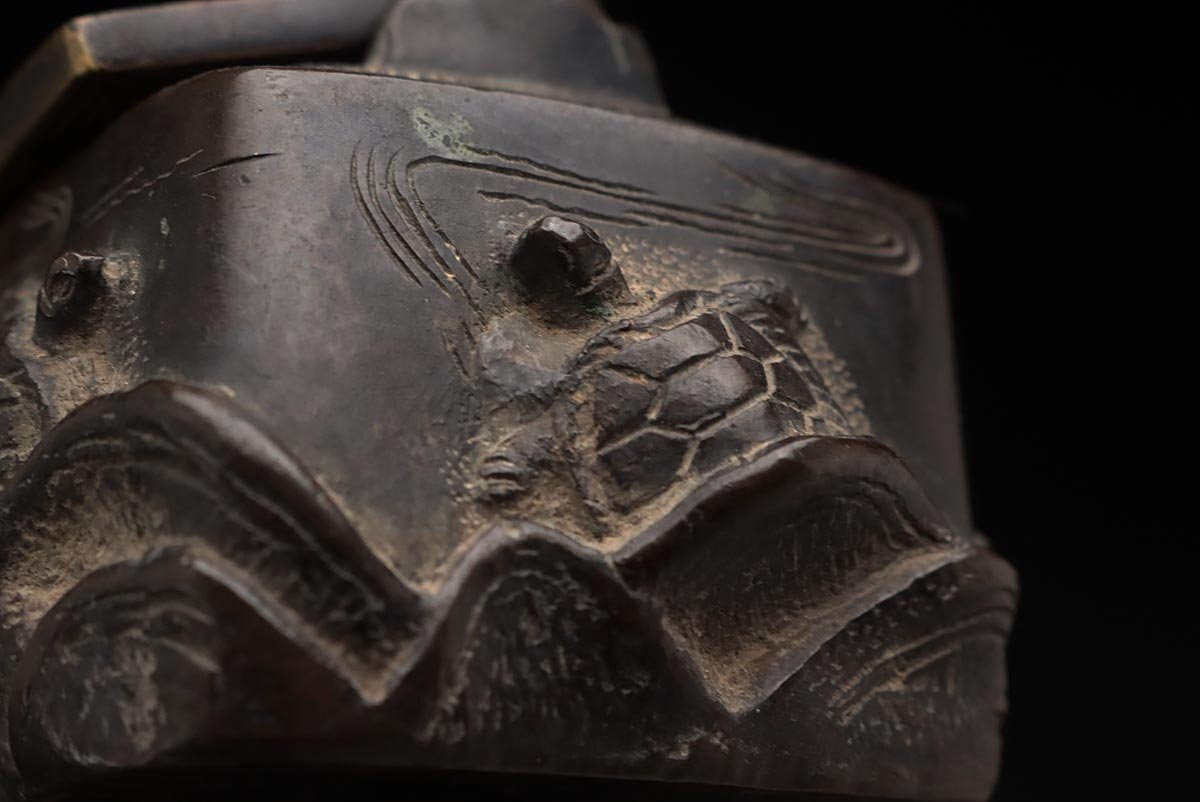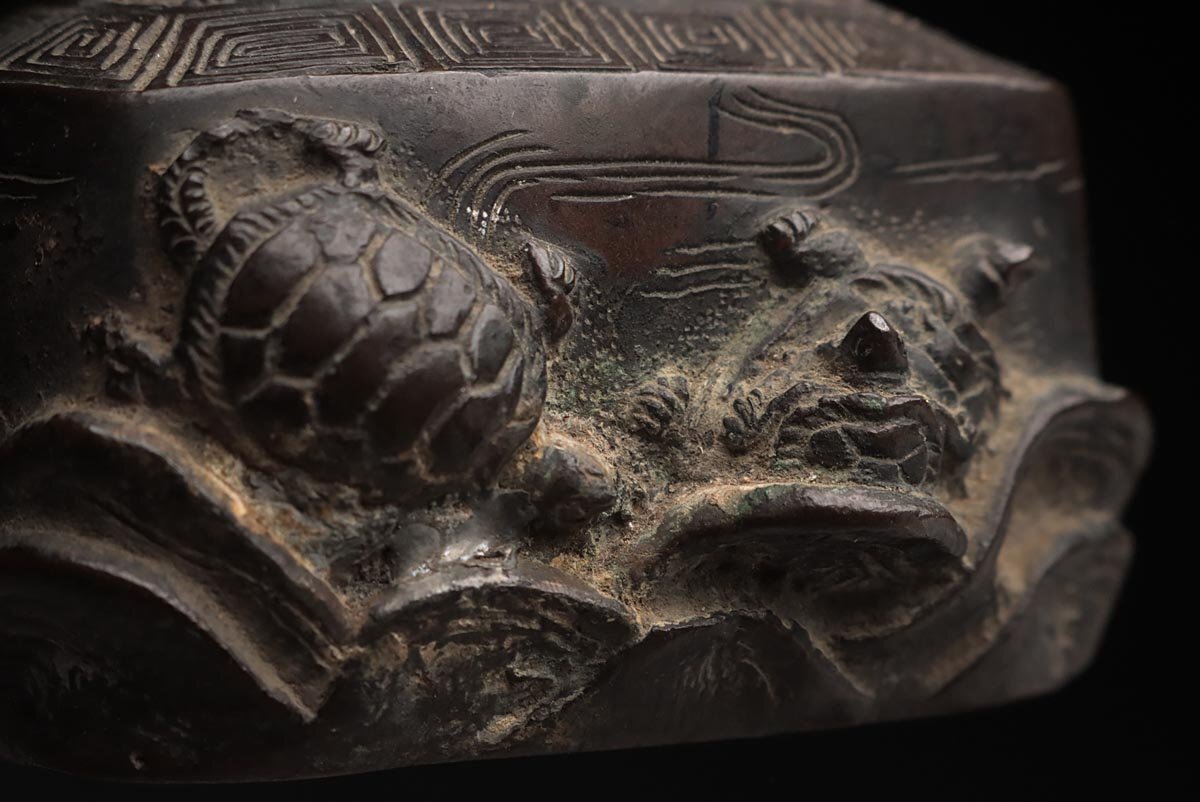 | ◆ 時代金工 古銅 波に亀盛上文 水注形 水滴 幅11cm / 重395g・銅群亀図水滴・硯滴 書道具 文房四宝 古美術 ◆