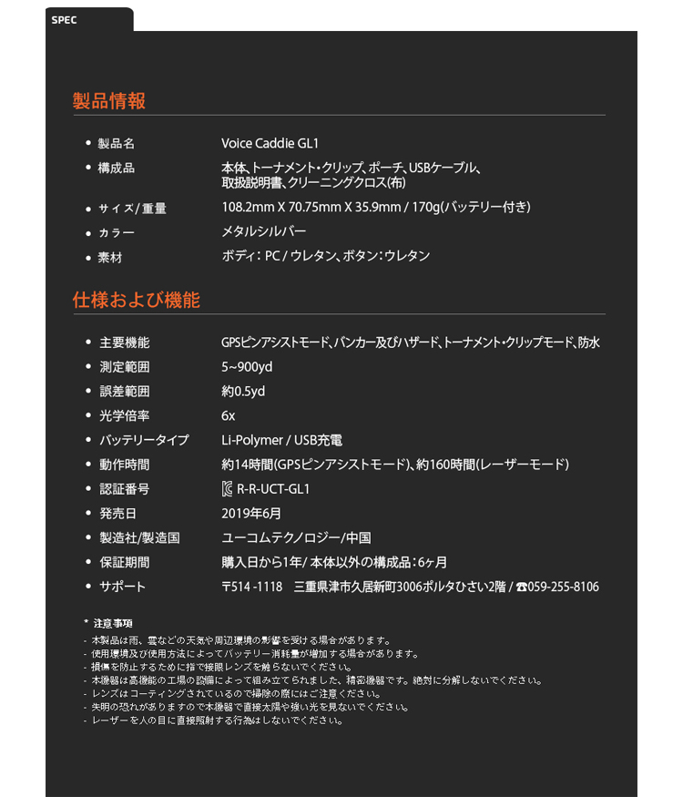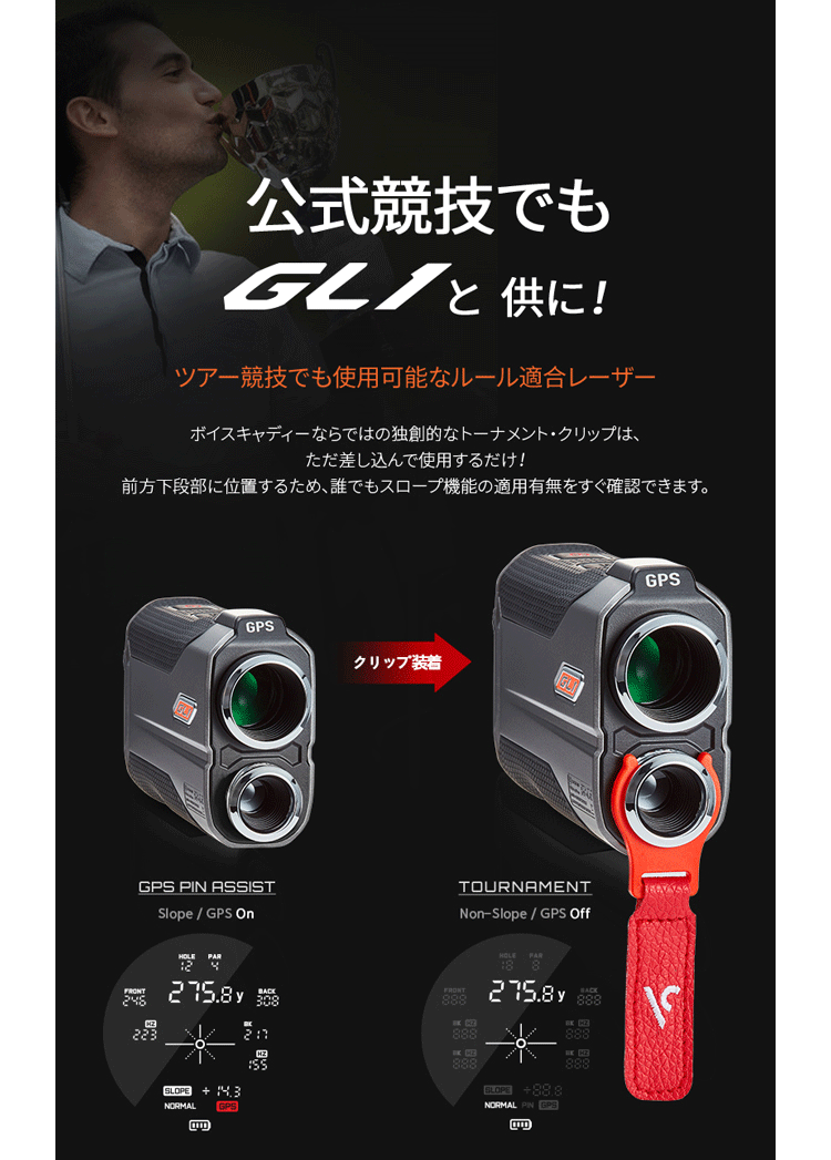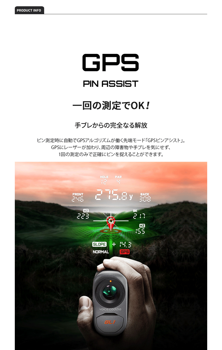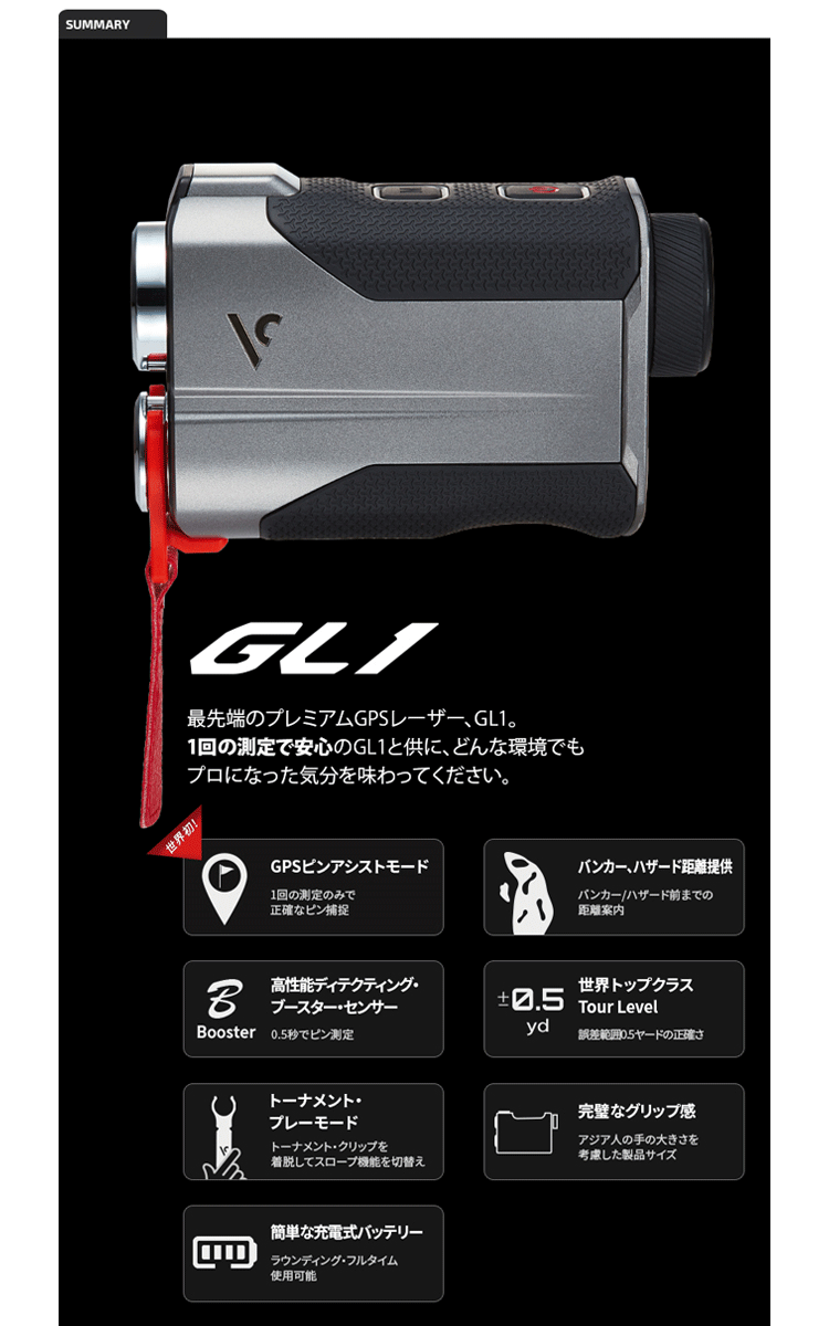 【商品特徴】 今までのレーザー距離計とは一味違う。 ハイブリッド次世代レーザー距離計。 ●GPSピンアシストモード ●バンカー、ハザード距離提供 ●高性能ディテクティング・ブースター・センサー ●世界トップクラスTour Level ●トーナメント・プレーモード ●完璧なグリップ感 ●簡単な充電式バッテリー 【商品詳細】 ●状態:新品・未使用品(保証書等付属品完備) ●サイズ:108.2mm,70.75mm,35.9mm/170g(バッテリー付き) ●素材:ボディ/PC・ウレタン ボタン/ウレタン ●光学倍率:6x ●測定範囲:5~900ヤード ●誤差範囲:約0.5以内ヤード以内 ●動作時間:約14時間(GPSピンアシストモード)、約160時間(レーザーモード) ●バッテリー:Li-Polymer/USB充電 【パッケージ内容】 ●製品本体 ●トーナメント・クリップ ●ポーチ ●USBケーブル ●クリーニングクロス(布地) ●取扱説明書 ※撮影時の光量の具合や、ご覧いただいております画面環境によりまして、実際の商品と若干色味が違う場合がございます。