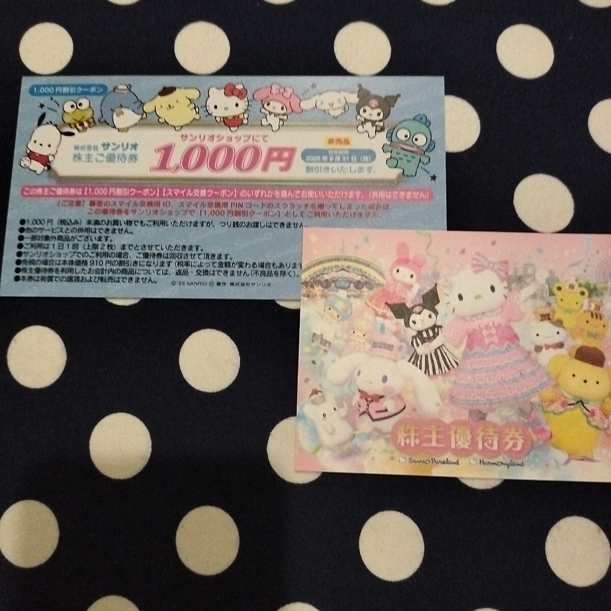 サンリオ株主優待券1枚と1000円割引クーポン(スマイル交換クーポン)1枚になります。