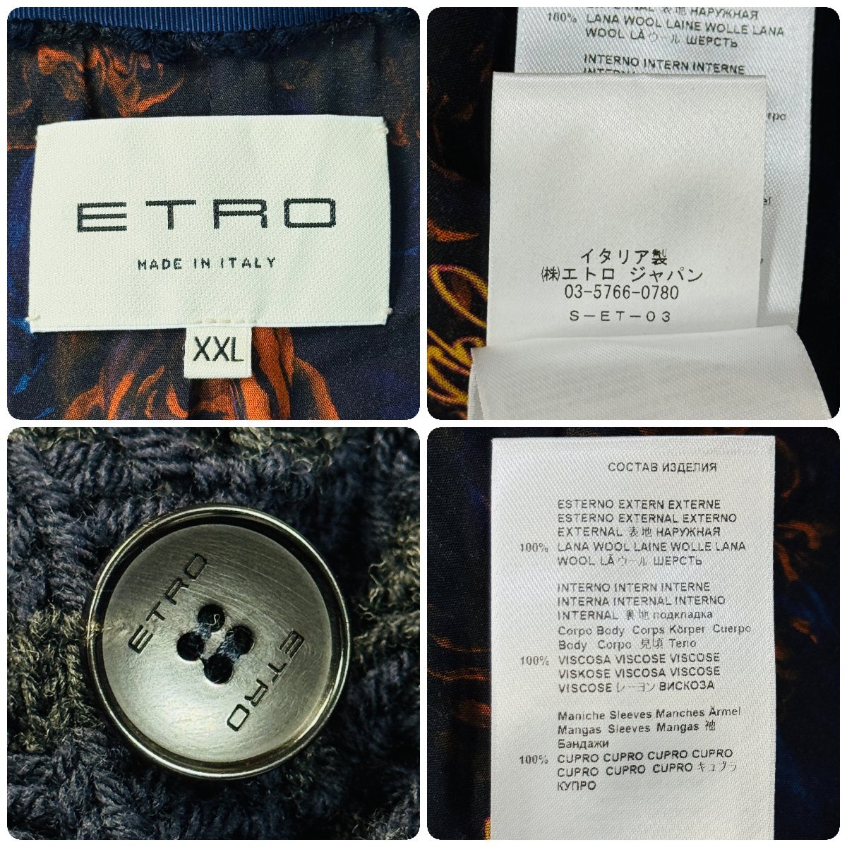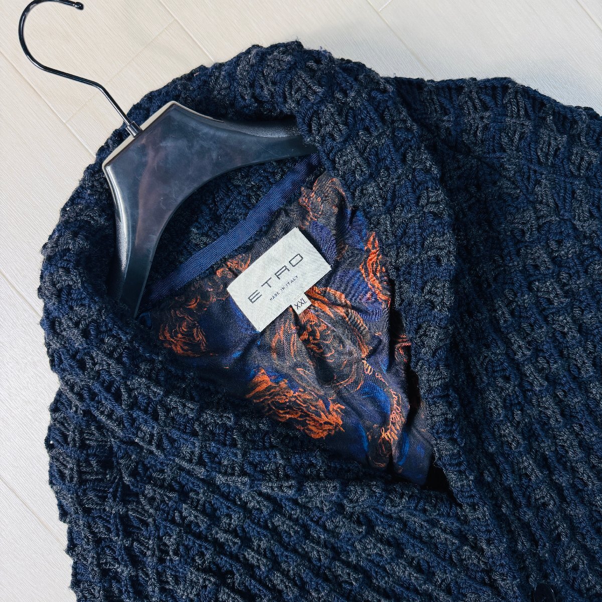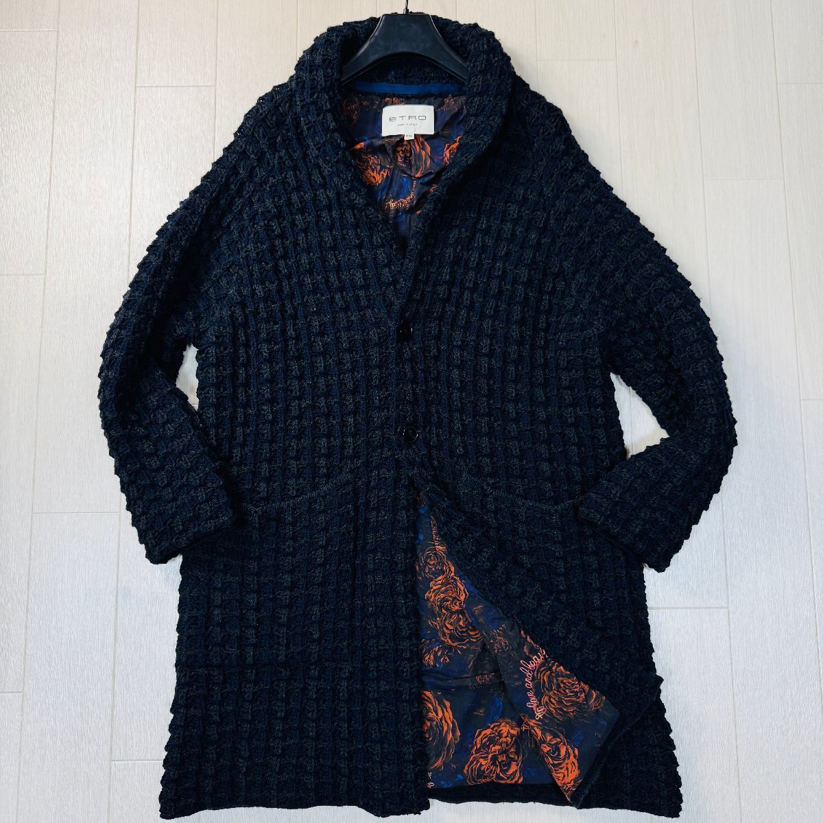 美品/2XL-3XL相当★エトロ ETRO ケーブル編み ニットコート チェスターコート ジャケット アウター メランジウール 厚手 薔薇柄 メンズ 紺