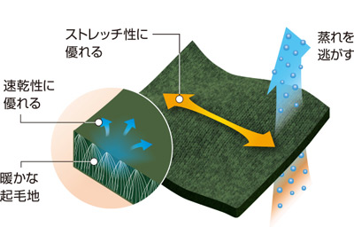 細かく密集した繊維の間に暖かな空気を多く蓄えるため、軽量ながら高い保温性を備えます。