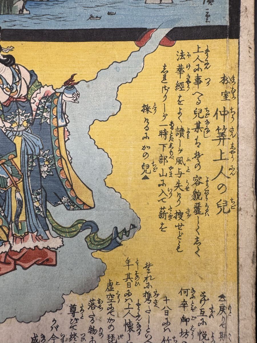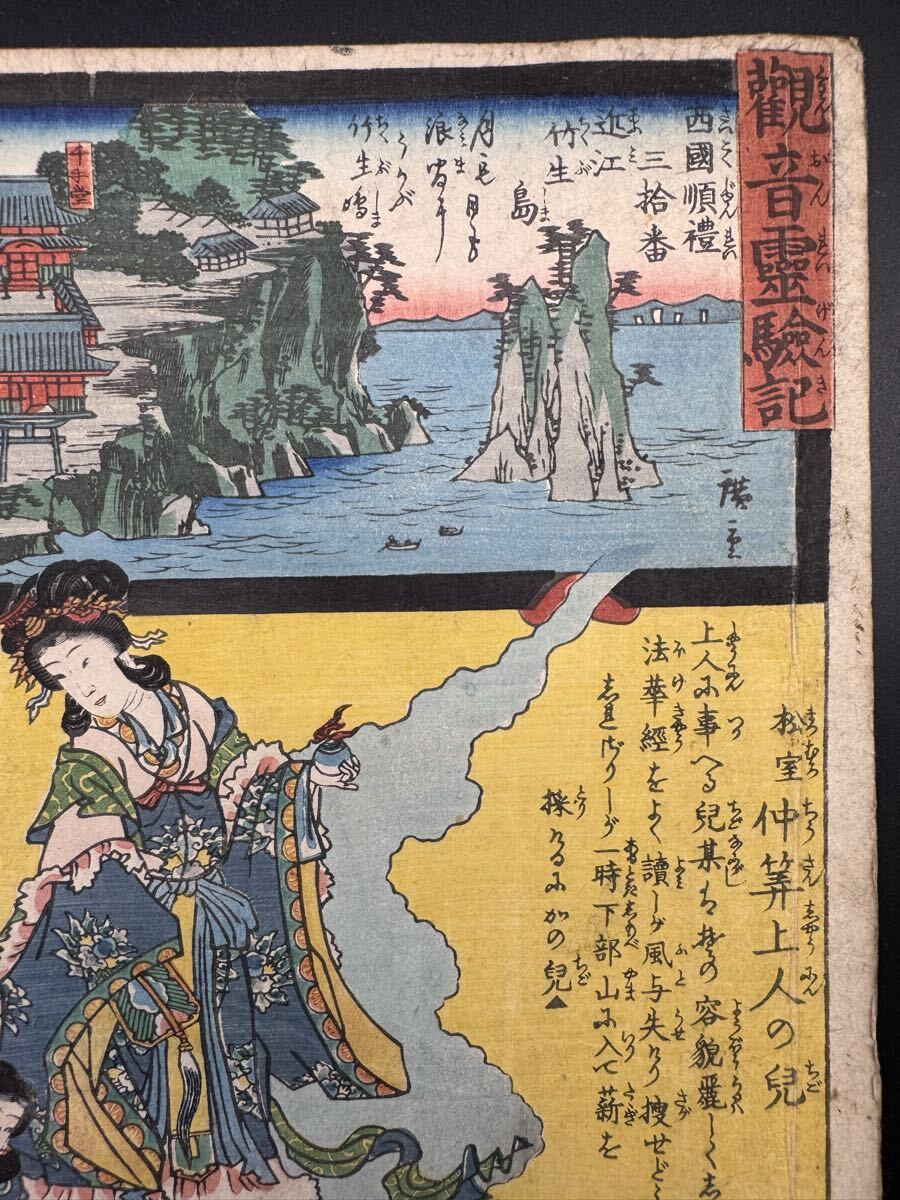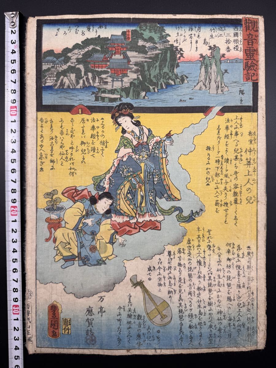 【真作】本物浮世絵木版画 三代歌川豊国/二代歌川広重「観音霊験記 西国順礼 仲算上人の児」江戸期 名所絵 大判 錦絵 保存良い 裏打ち