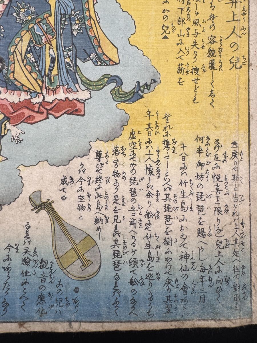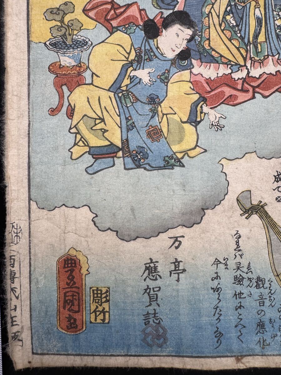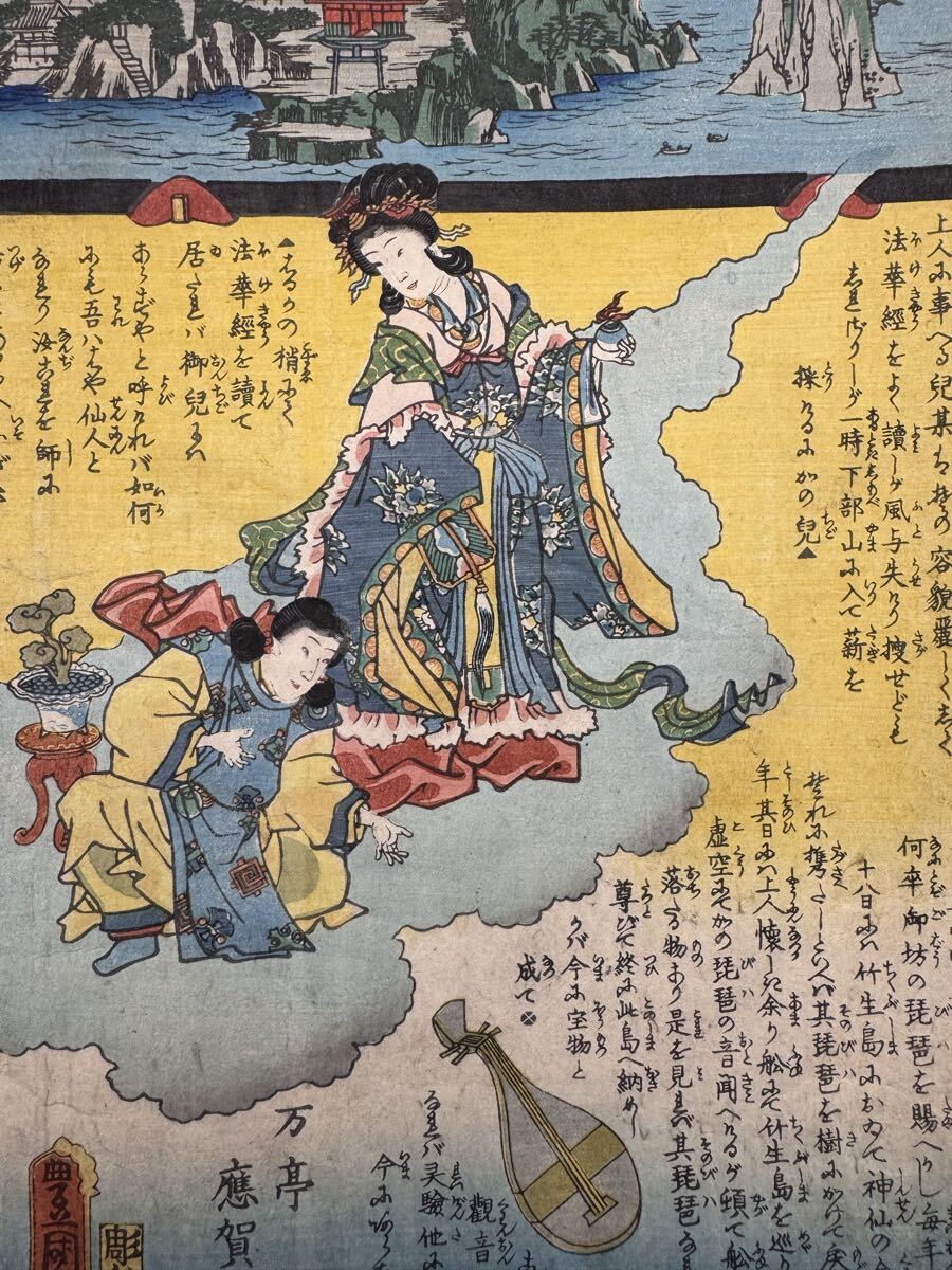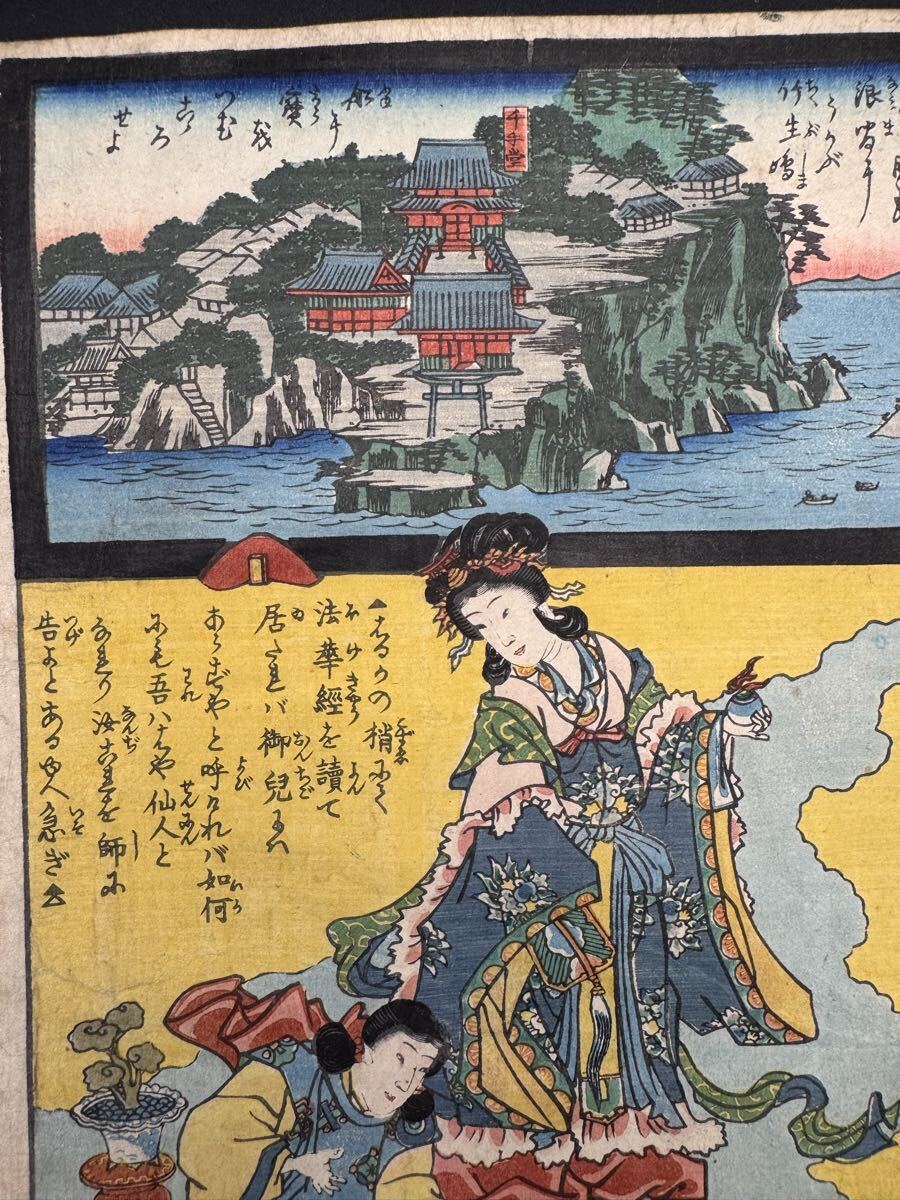 【真作】本物浮世絵木版画 三代歌川豊国/二代歌川広重「観音霊験記 西国順礼 仲算上人の児」江戸期 名所絵 大判 錦絵 保存良い 裏打ち