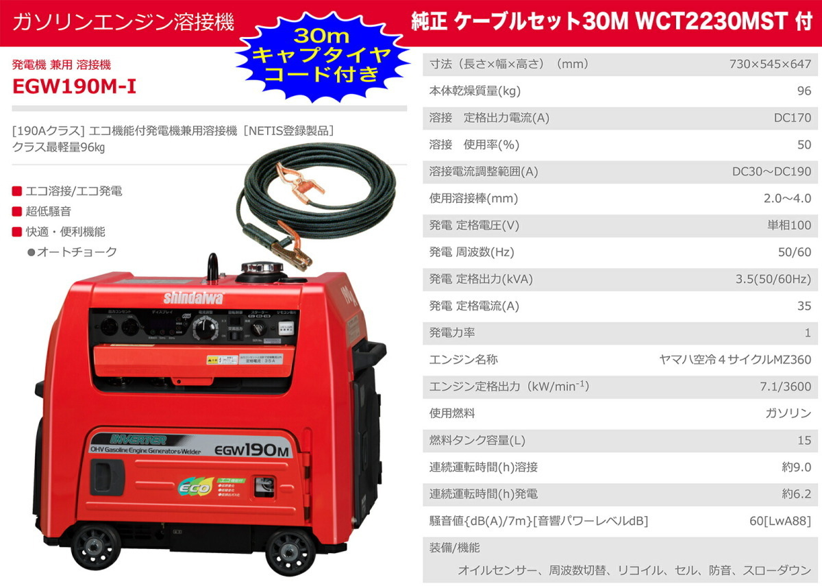 〈新ダイワ〉発電機 兼用 エンジン溶接機 EGW190M-IST 純正 ケーブルセット30M WCT2230MST 付【代引不可・車上引き渡し品】株式会社やまびこ 新ダイワ EGW190M-IST [190Aクラス]単相3線インバータ発電機兼用溶接機 (30mキャプタイヤ付き)※こちらの商品は、「代金引換」支払を ご利用いただけません。《仕様》図表にて、ご確認ください。(※図表は、メーカー公表の物を流用しております。当店にて取扱いの無い品も、含まれる場合がございます。)納期 【メーカー直送品・車上引き渡し品】メーカー在庫があれば配送情報の出荷予定に従い発送します。※メーカー直送品のため、サイト上では在庫有りの表示がありましても、 稀にメーカーが在庫切れの場合もございます。その様な場合は、何卒ご容赦ください。(別途メール等にて、ご連絡させていただきます。)【代引不可】※こちらの商品は、「代金引換」支払を ご利用いただけません。複数購入可能です!!