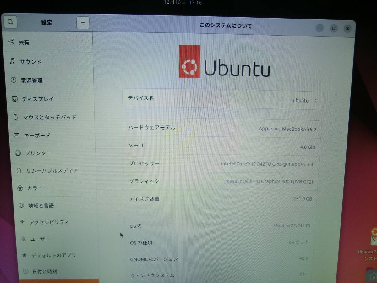 【中古】Apple MacBook Air A1466(液晶不調)/Intel Core i5-3427U/メモリ4GB/250GB SSD/Mac OS/管:NPC2511-1087