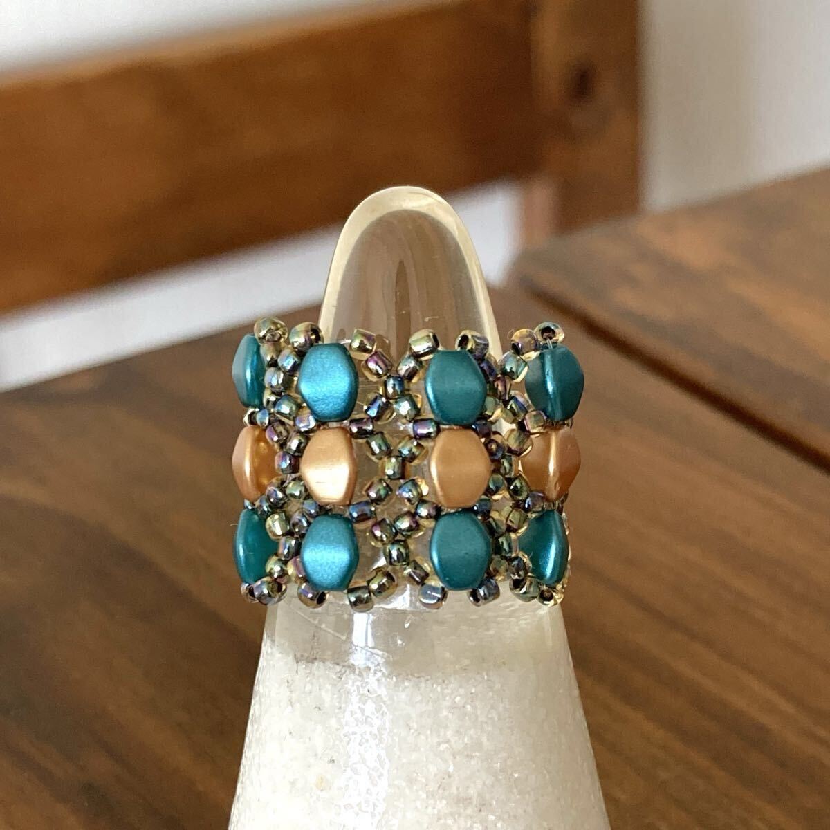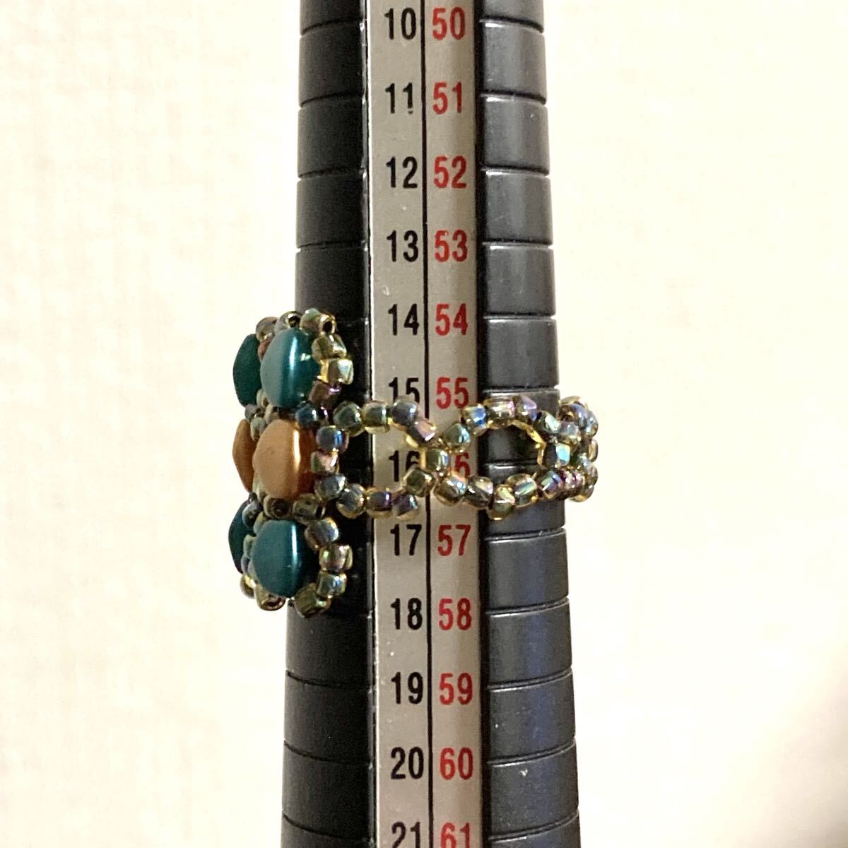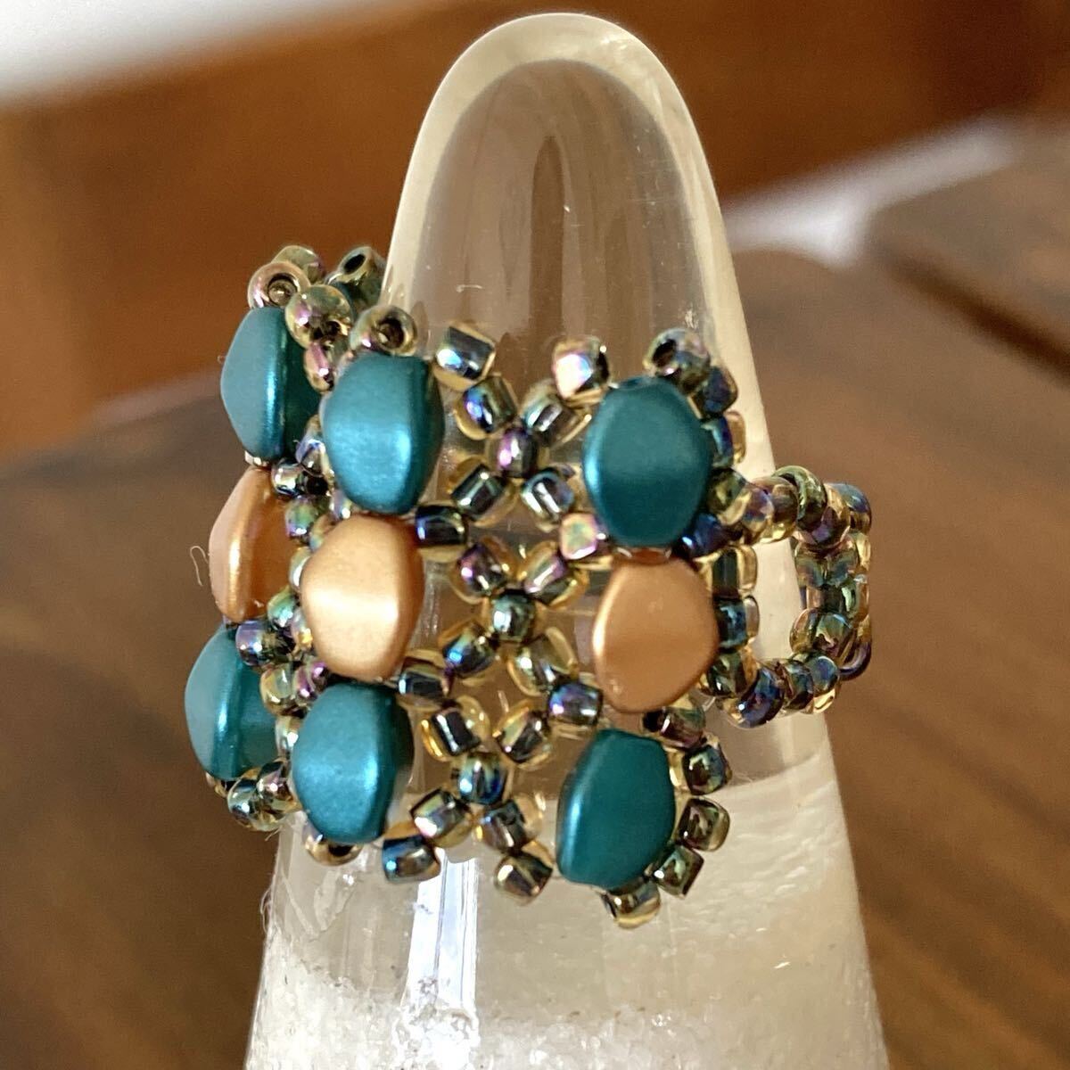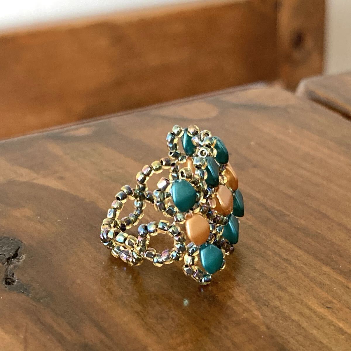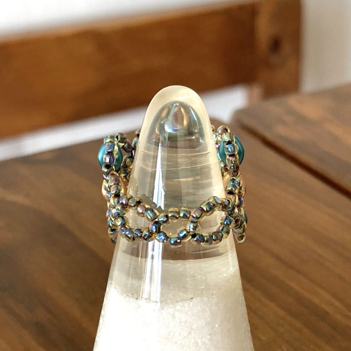 5mmのグリーン、マットゴールドのピンチビーズ、グリーンオーロラ系のスリーカットビーズで作ったリングです。