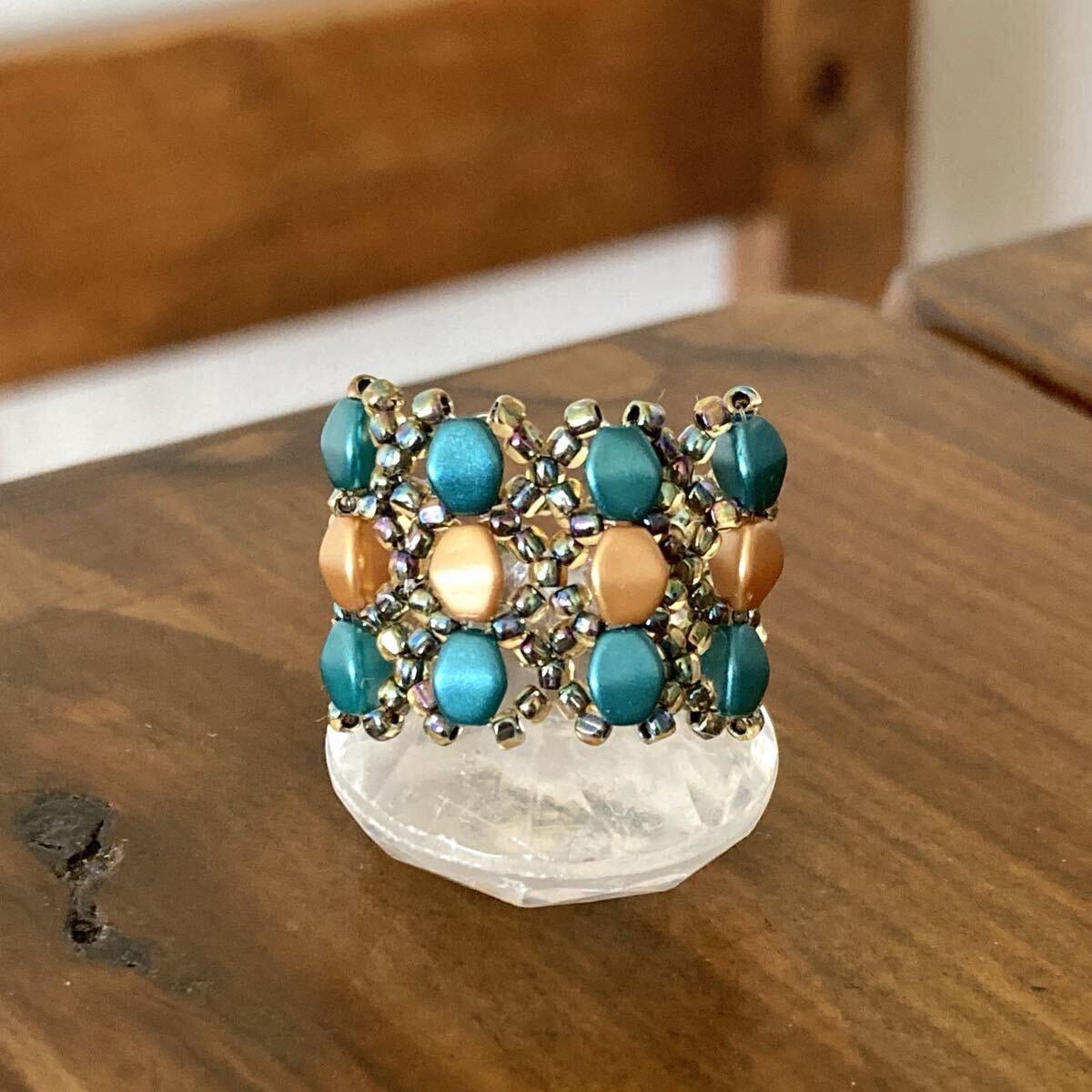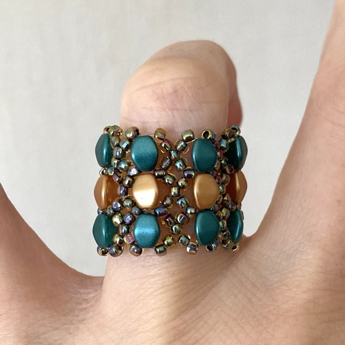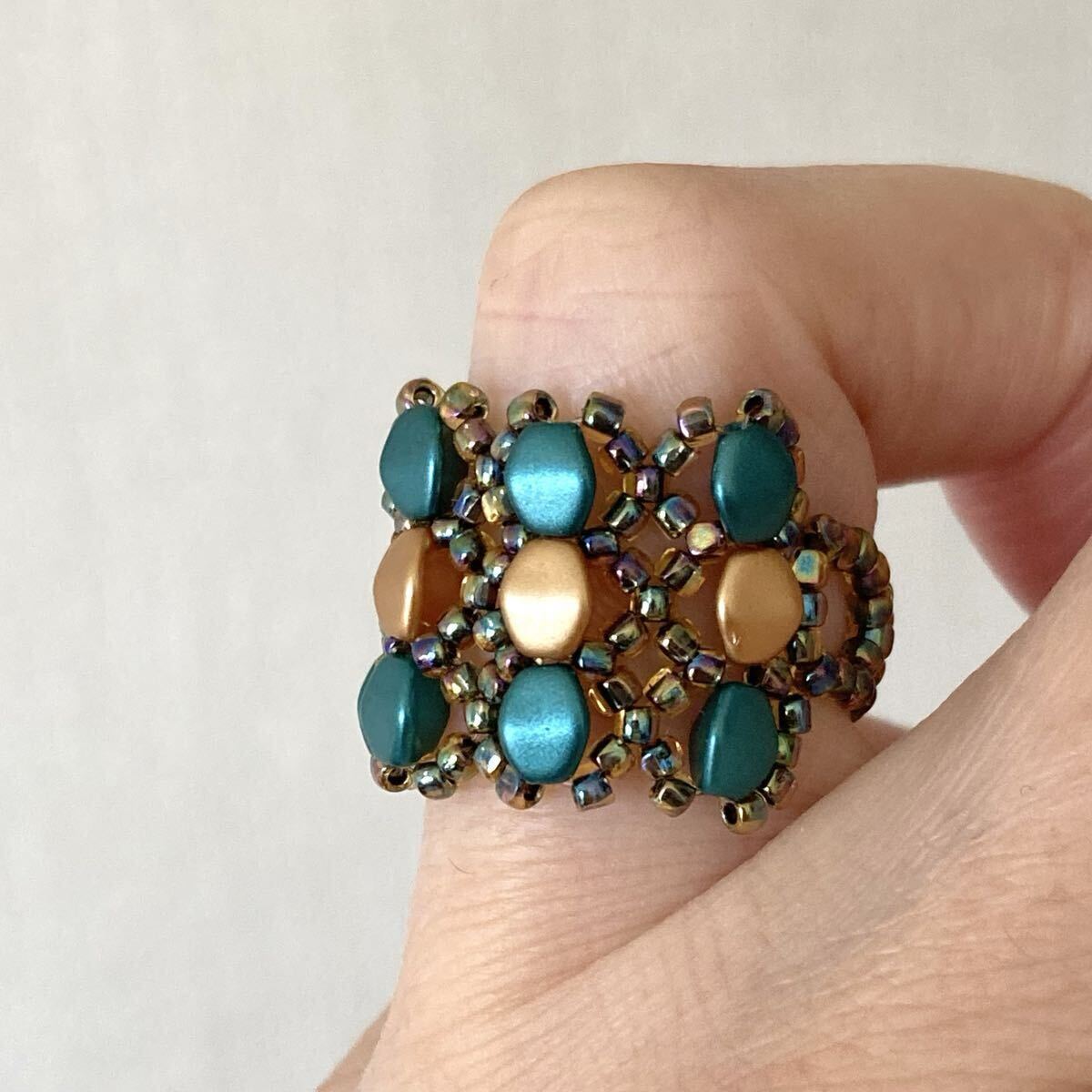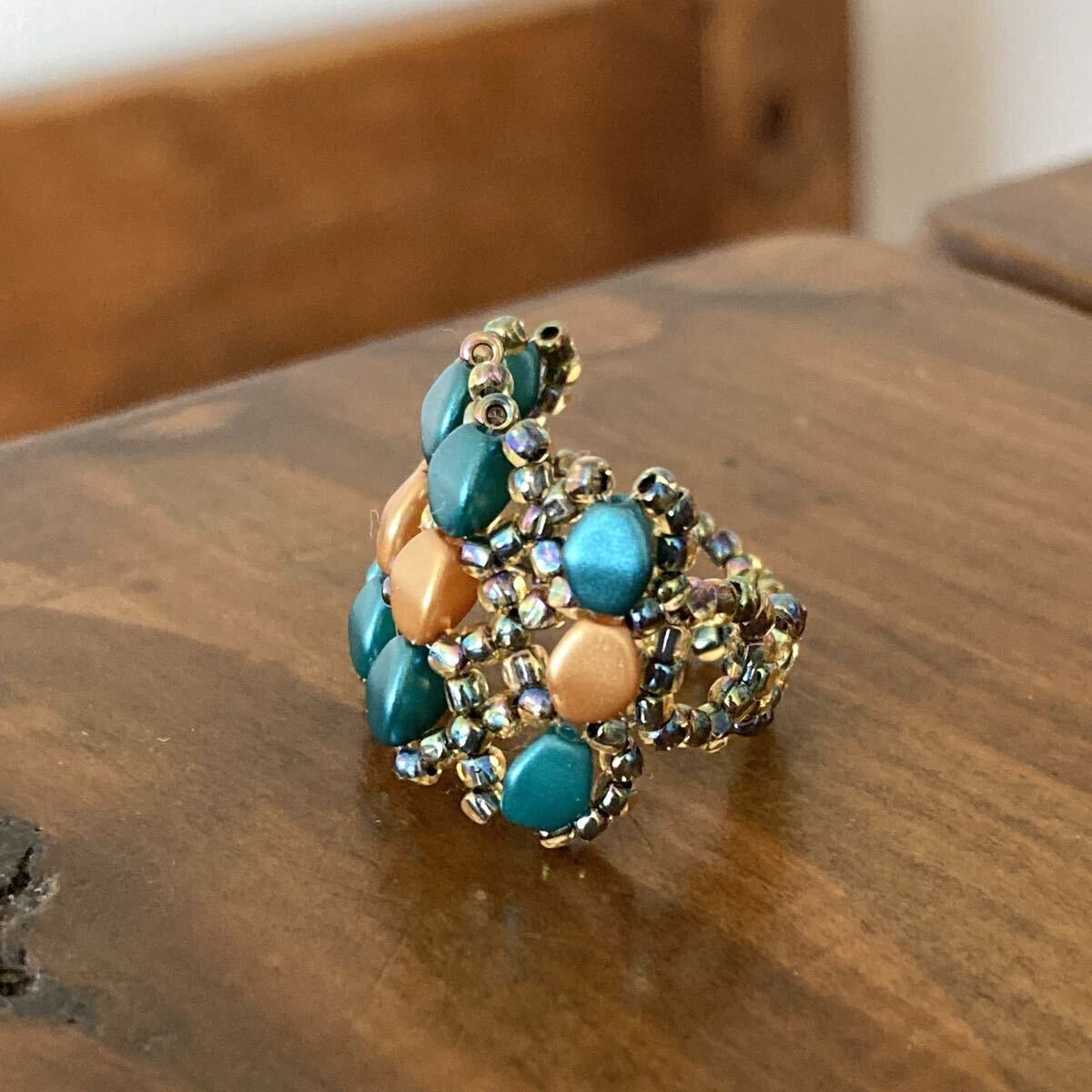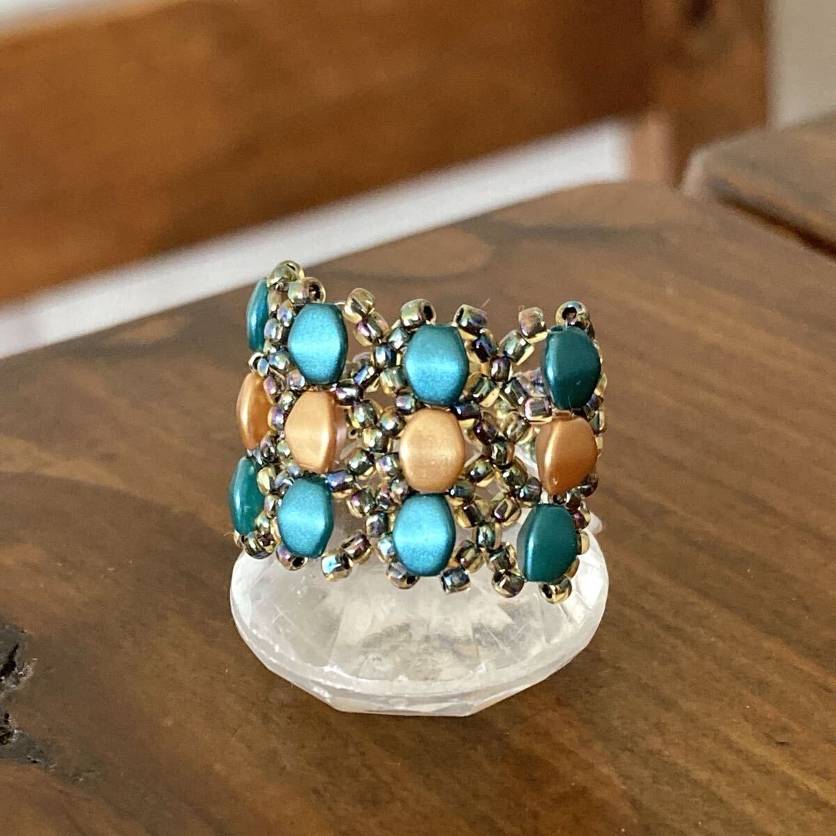 5mmのグリーン、マットゴールドのピンチビーズ、グリーンオーロラ系のスリーカットビーズで作ったリングです。
