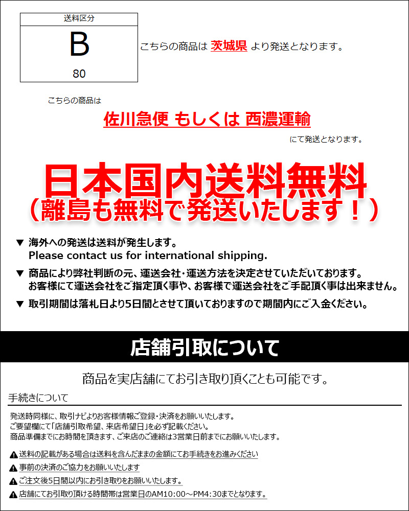 Ⅲ.一旦成功中标,您必须全额支付该拍品(成交价+消费税+银行转账费+日本邮费+代购费)。