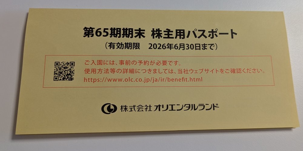 オリエンタルランド 株主用パスポート 1枚 有効期間::2026/06/30まで |