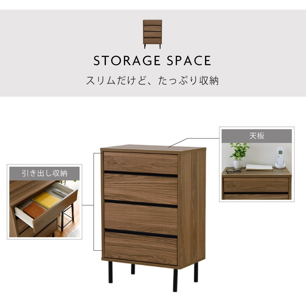 | 落ち着いた木目調のブラウンとブラックスチールの組み合わせがモダンな印象を与える、 北欧テイストシリーズ“Fresser”。 4段のスリムチェストは、シンプルだからこそ使いやすいアイテムです。 |