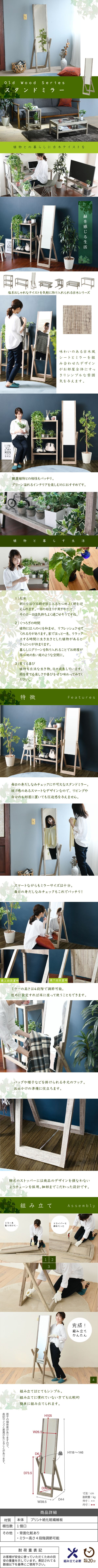 | 優しい色調で味わい深い古木風シートと美しい強化ガラスを組み合わせたデザインが、 お部屋全体にすっきりとした印象を与えるスタンドミラー。 圧迫感のないシンプルなデザインは、お気に入りの小物や観葉植物、ドライフラワーなどを一層際立たせてくれます。 全身を映してくれるミラーはお出かけ前の必需品。 フック部分にはストールや帽子などを掛けられます。 |