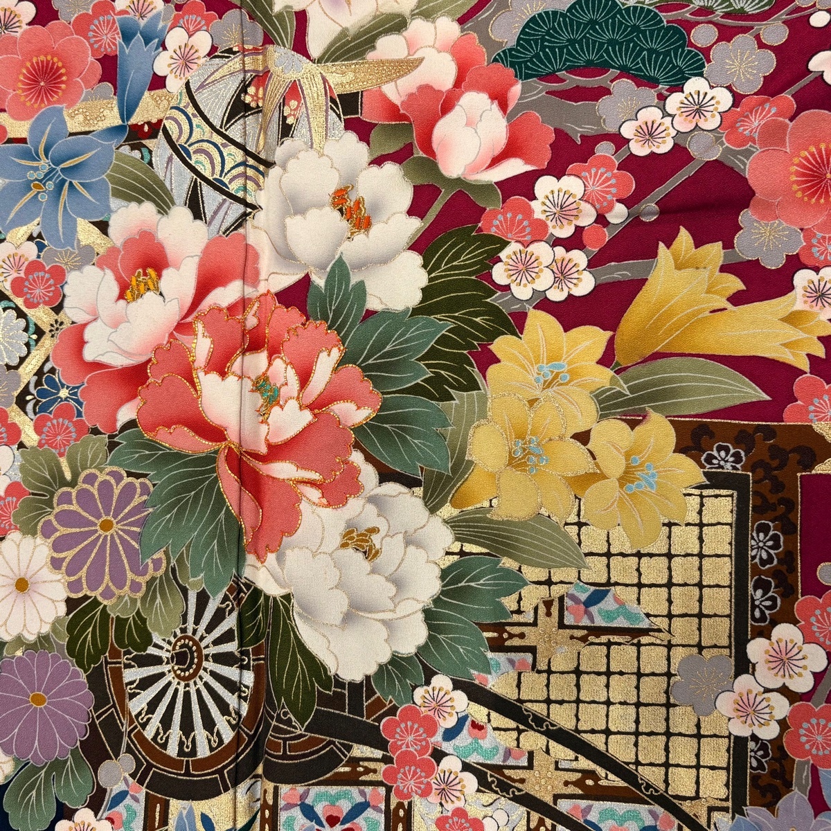 | 振袖 美品 秀品 花車 松竹梅 金糸 金彩 赤紫 袷 身丈155.5 裄丈62.5 S 正絹 【中古】 |