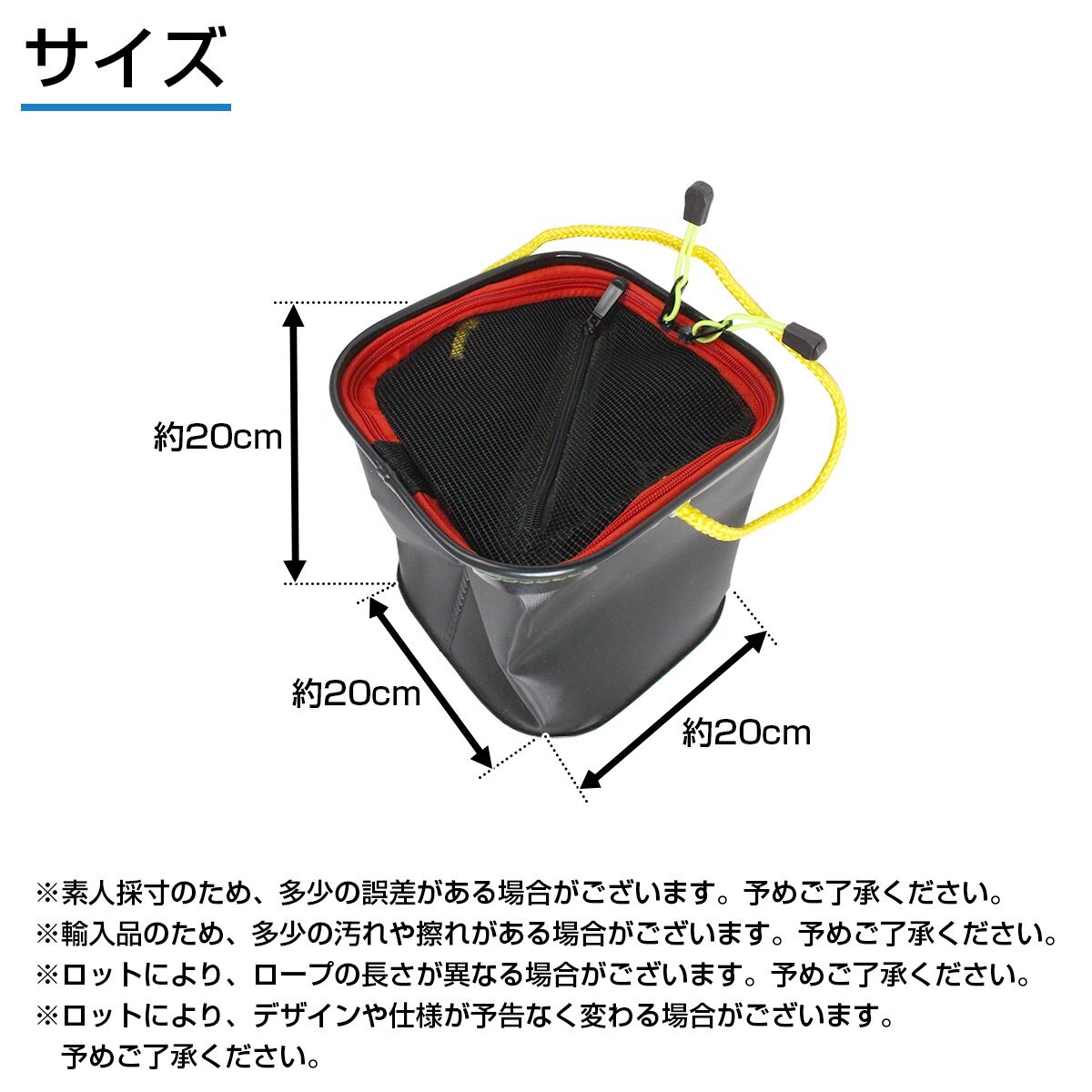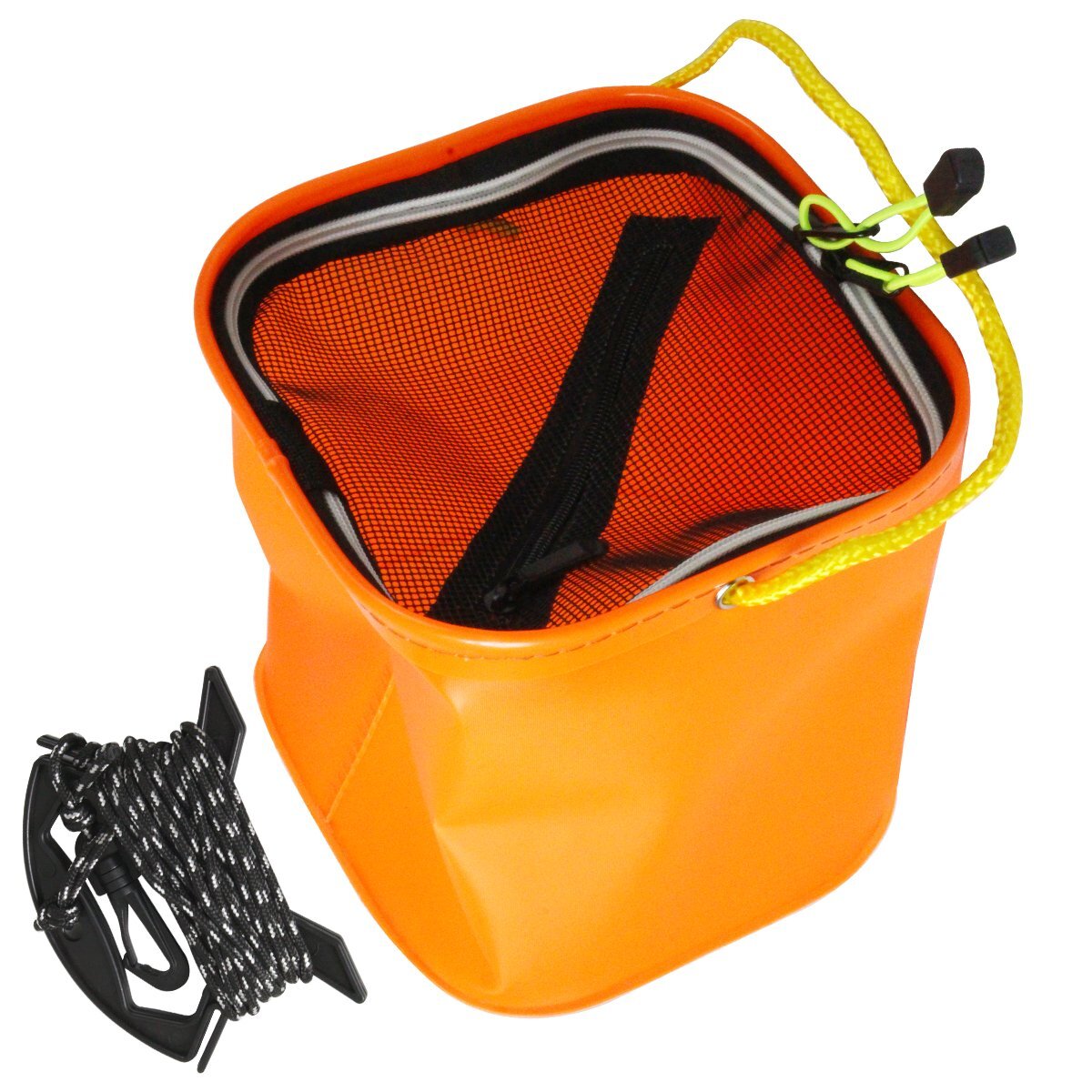 折り畳み式 コンパクト バケツ 20cm『持ち手紐』ロープ/メッシュカバー付き 水汲み オレンジ 釣り ガーデニング タンク 砂遊び