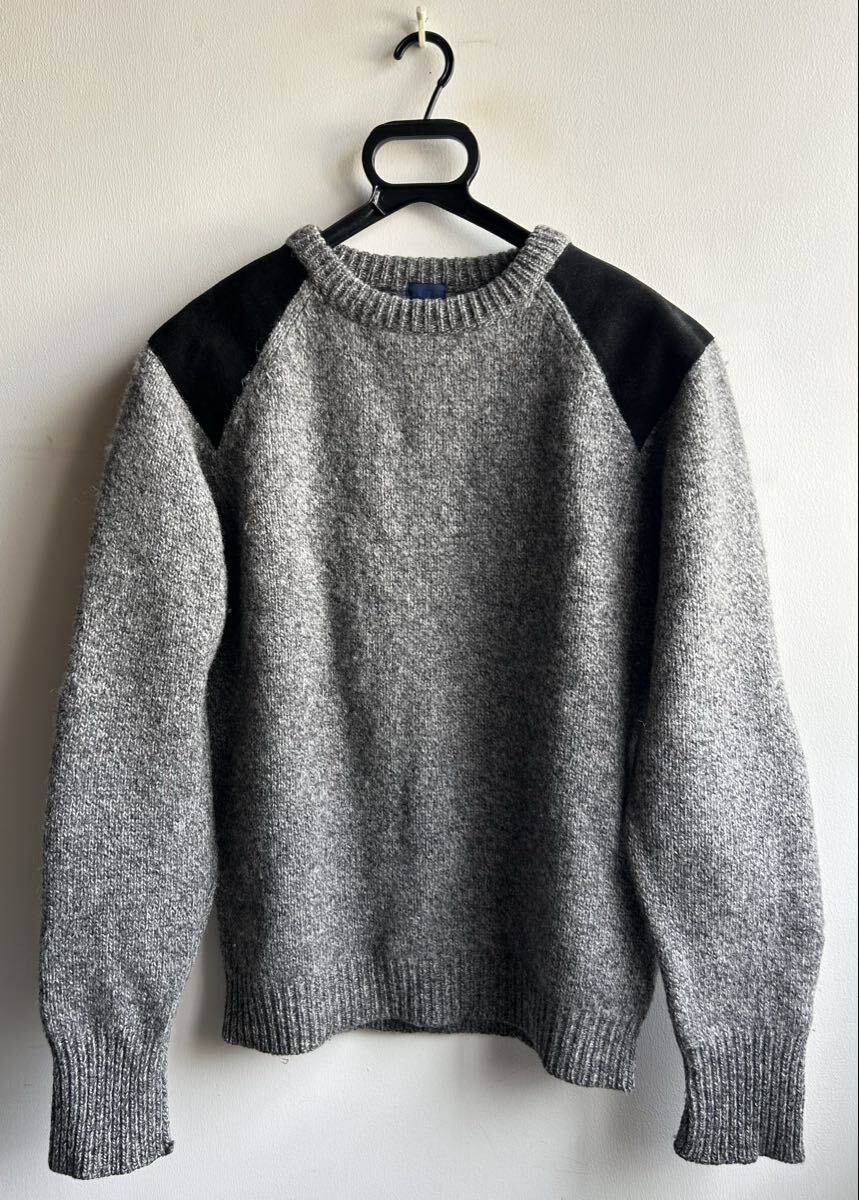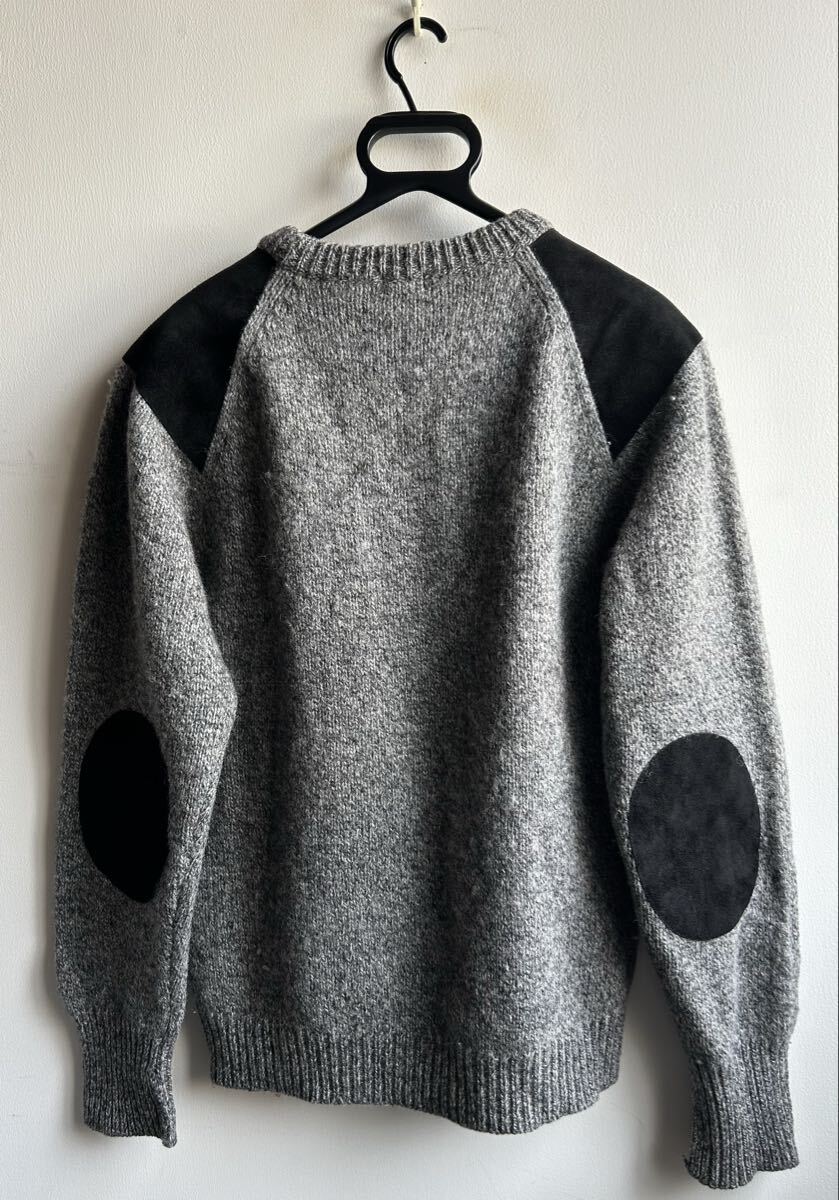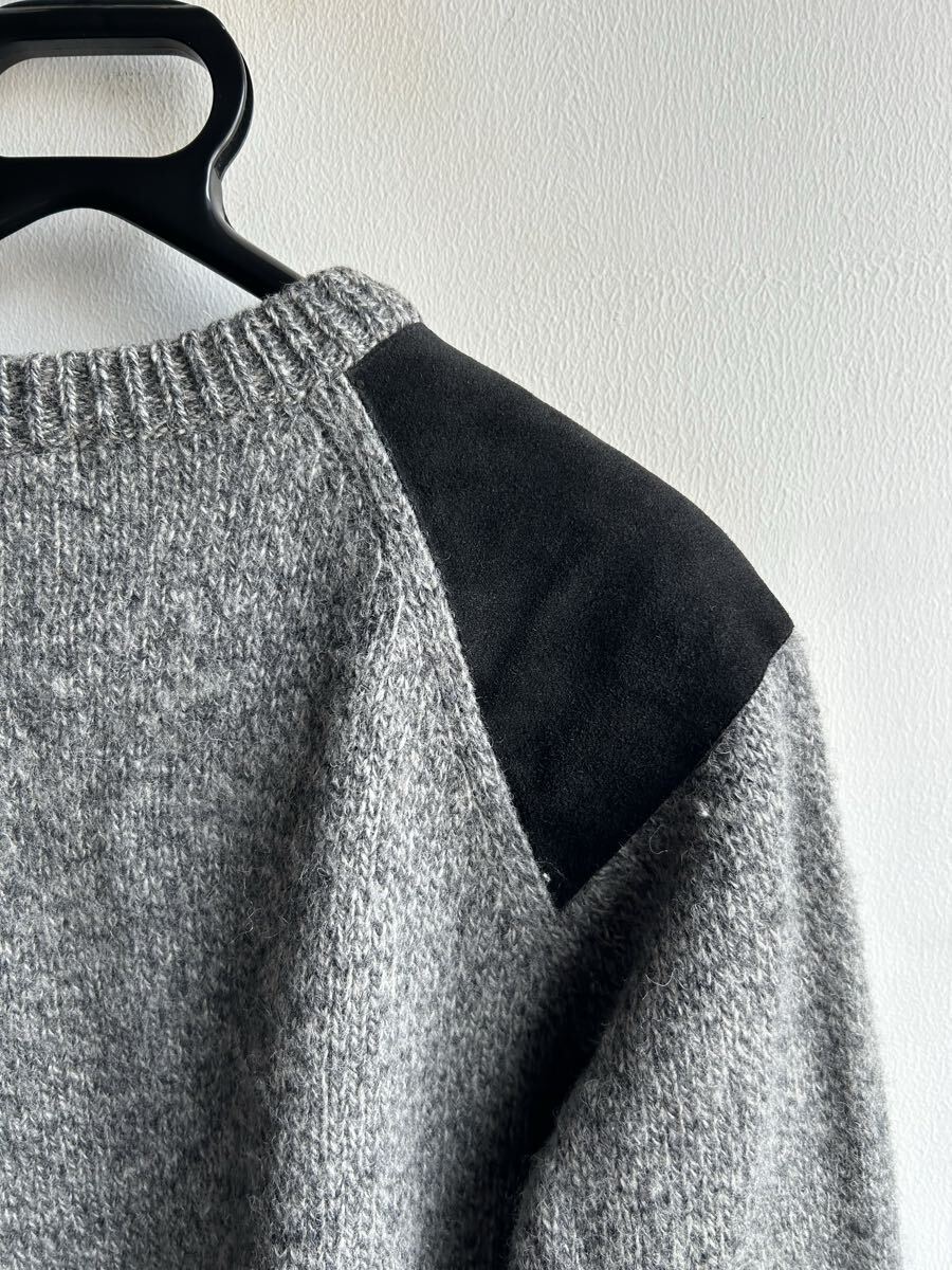 ショルダーパッチと、エルボーパッチが可愛い、シンプルなクルーネックニット、