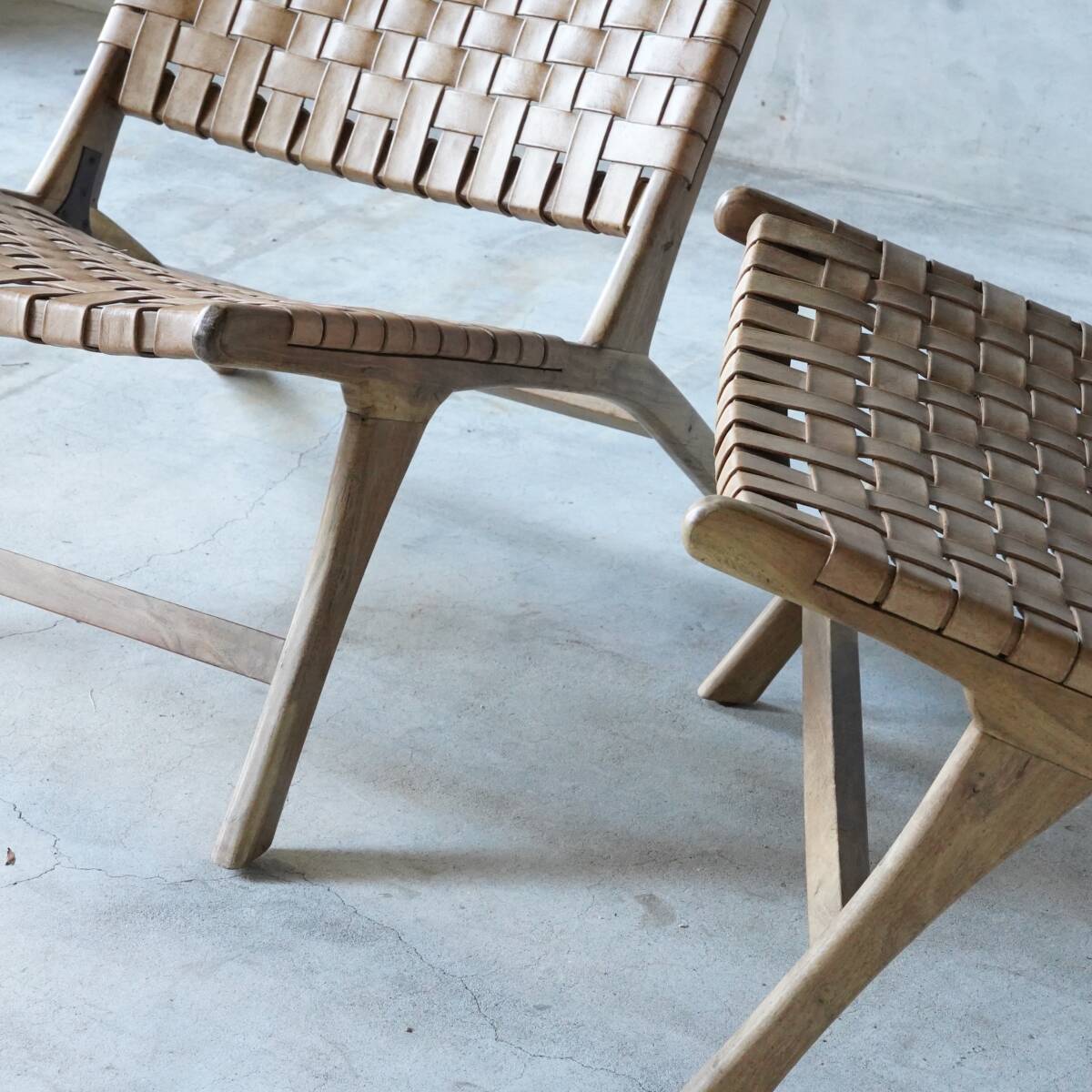 座面や背もたれ部分は、味のある明るい色味のバッファローレザーで、とても素敵です。