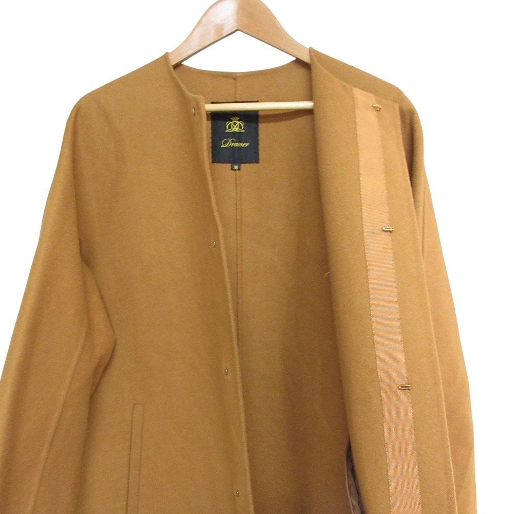 美品 DROWER ドゥロワー ウール100% ダブルフェイス ノーカラーコート 36 キャメル