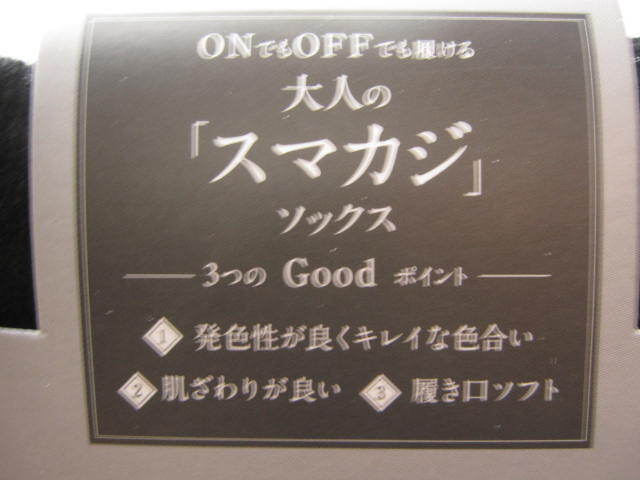 オトナの「スマカジ」ソックス 3つのGOODポイント ①発色性が良くキレイな色合い②肌ざわりが良い③履きぐちソフト
