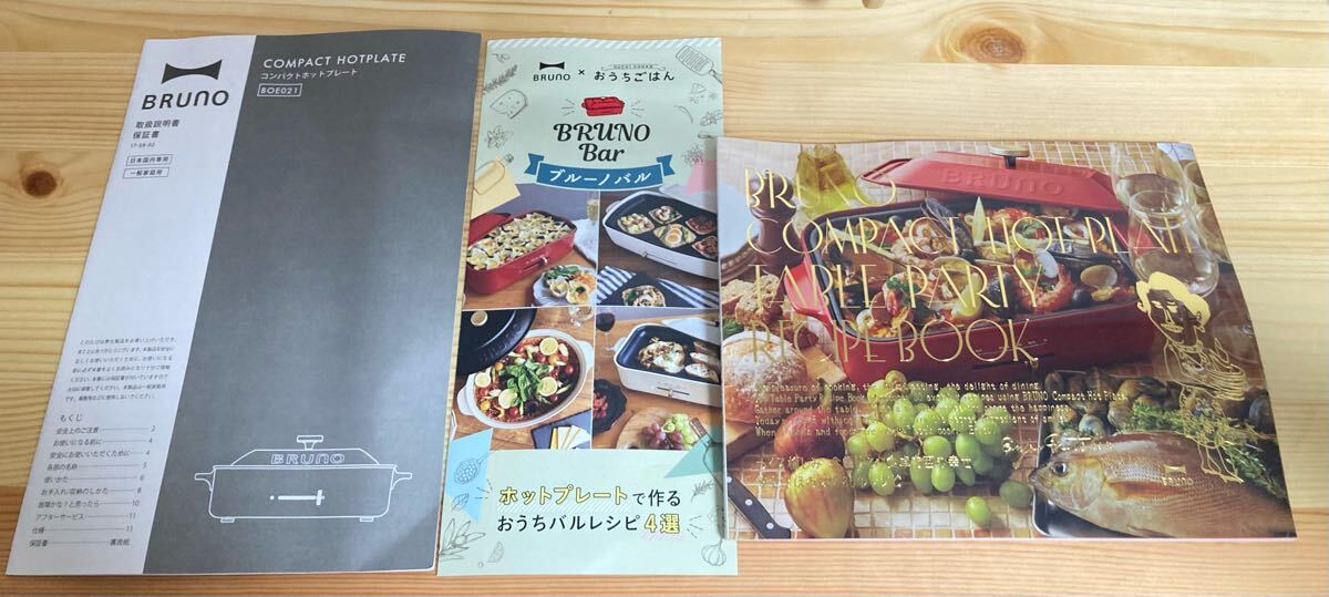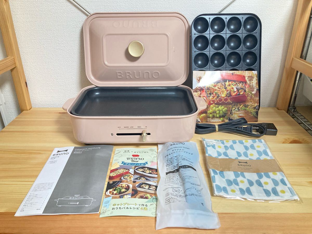 ホットプレート本体、電源ケーブル、取扱説明書、レシピブック、平プレート、たこ焼きプレート、新品3ウェイシリコントング、新品布巾