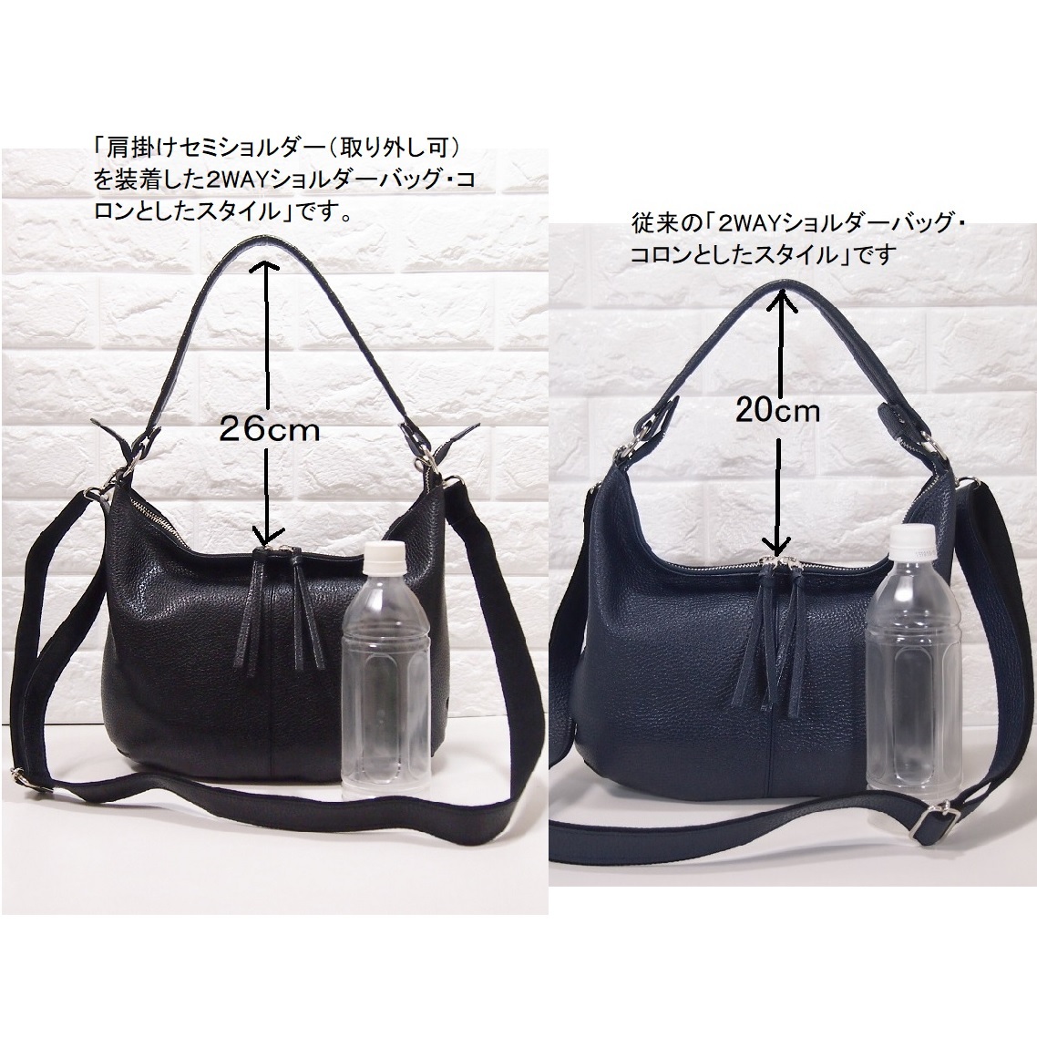 ●斜め掛けだけでなく、肩掛けで、しっかり使いたいというお声をいただき作ってみました。立ち上がりは26cmで、肩に掛かり易くしました。従来品より6cm長くなっております。