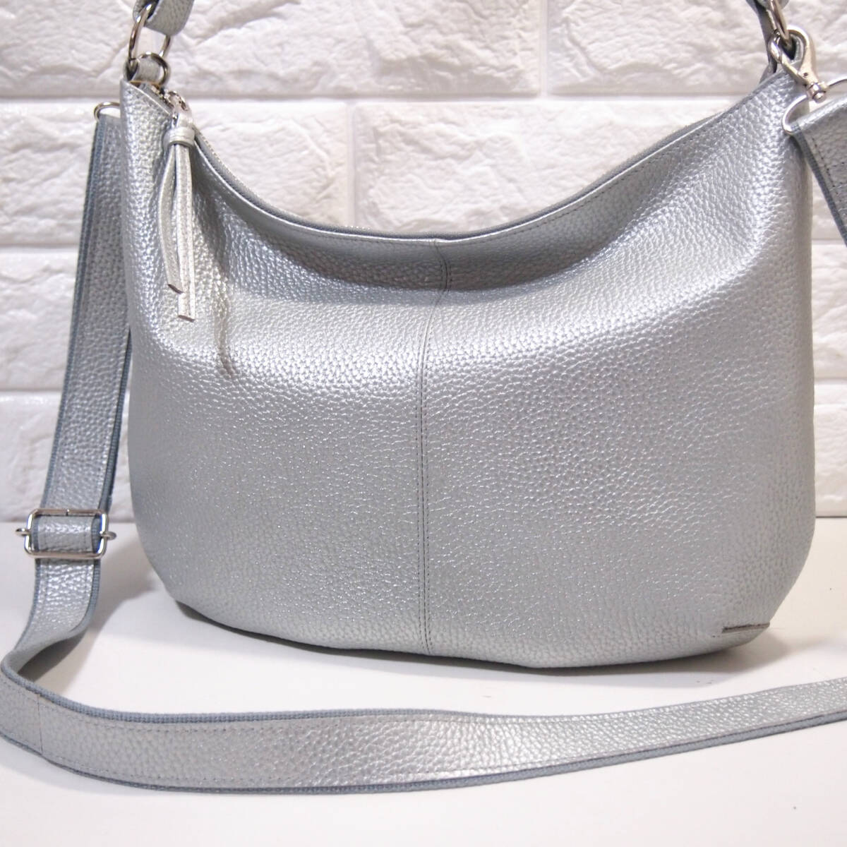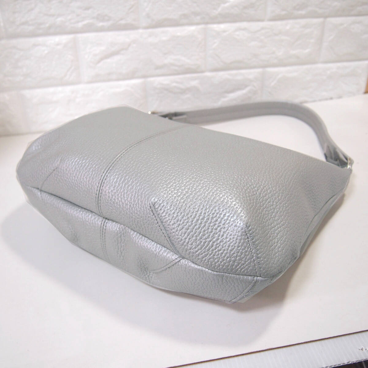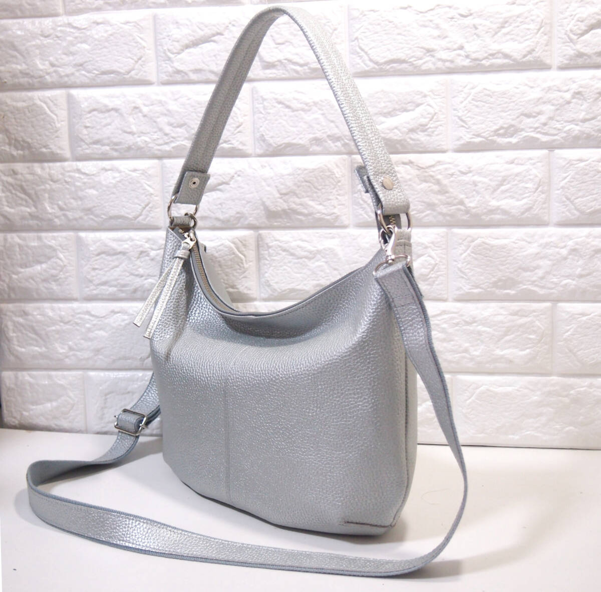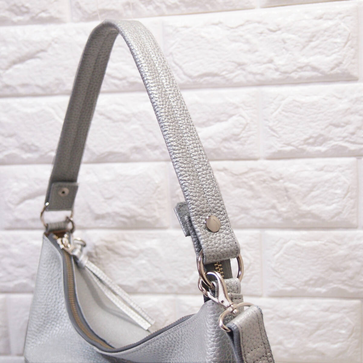★ハンドメイド★新品★日本製★牛革★2WAYショルダーバッグ(ロングハンドル・肩掛け)★シルバー色★コロンとしたスタイル★超軽量★