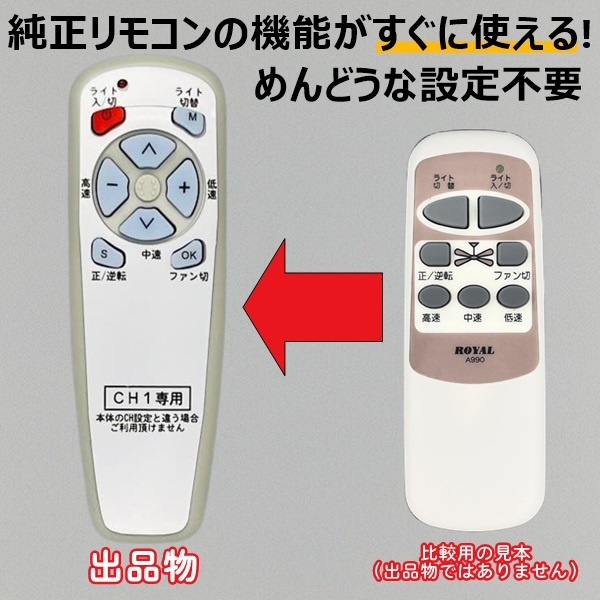 【商品名】 ROYAL A990 (CH1) 代替リモコン 【対応機種】 純正リモコンに「CH1」のシールが貼られている商品専用です。 A990 比較画像の右側の純正リモコンが付属する機種に使用出来ます。 上記機種以外については、質問欄よりメーカーと型番をご連絡頂ければ、対応品のご案内をしております。 【商品について】 左側の代替リモコンが出品物になります。右側のリモコンは見本画像です。 タイトル機種のリモコン信号を入力した、設定不要で使える純正品と同等の代替リモコンです。 乾電池は付属しません。別途ご用意下さい。(単4乾電池×2本) 【商品サイズ】 縦11.7cm×横3.9cm×高さ1.9cm 【発送について】送料無料 迅速発送を心掛けております。土日祝日はお時間を頂く場合ございます。 ポスト投函配達となり、日時指定は出来ません。 | ||