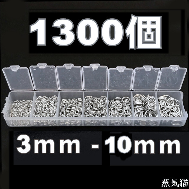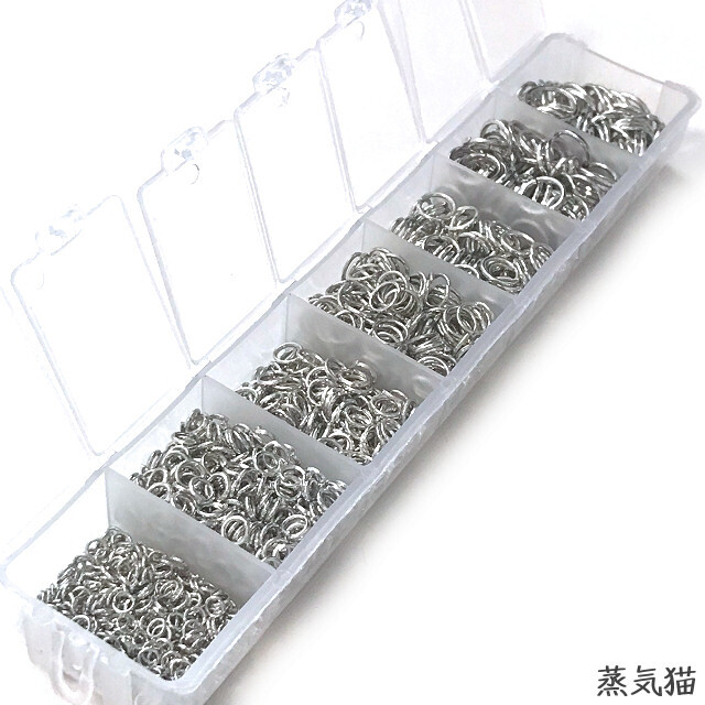 k8447 丸カン7種セット シルバー 約1300個です。7種サイズの丸カンが、1ケースに合計で約1300個入っております。ピアス、イヤリング、ネックレス、チャーム、ブレスレット、レジン等、様々な作品のアクセサリーパーツ素材として。